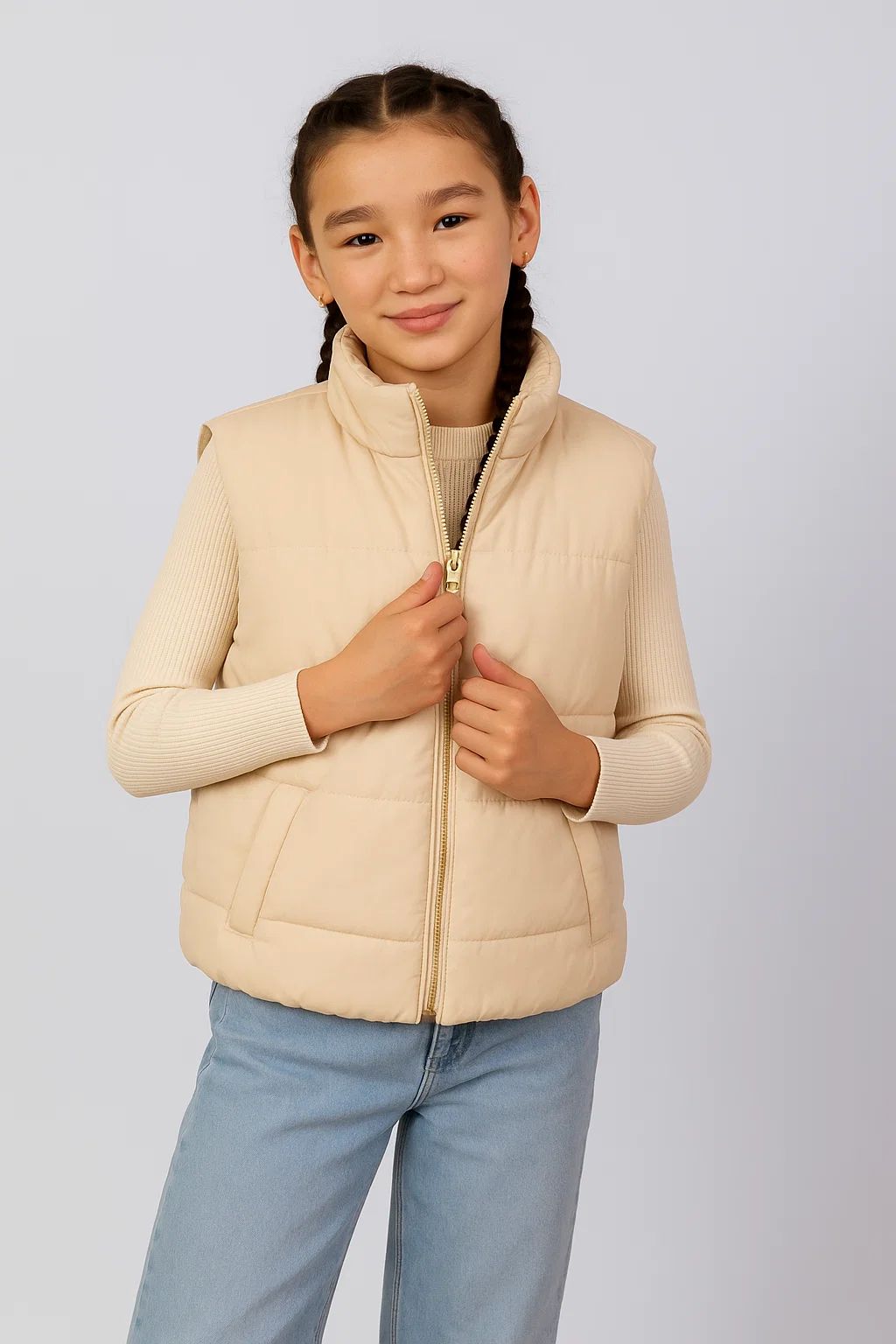 Стёганый жилет из плотной ткани с высоким воротником. Застёжка — двухцветная молния с защитой подбородка и бегунком в форме золотистого сердечка. Спереди — два кармана с косым входом. Внутри — мягкая бархатистая подкладка и именная бирка с блёстками. Наполнитель из переработанных материалов. Удобный и тёплый вариант для прохладной погоды.