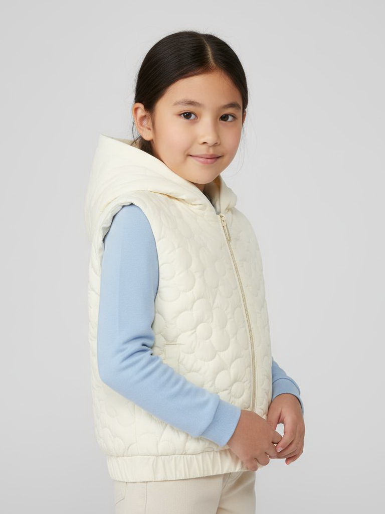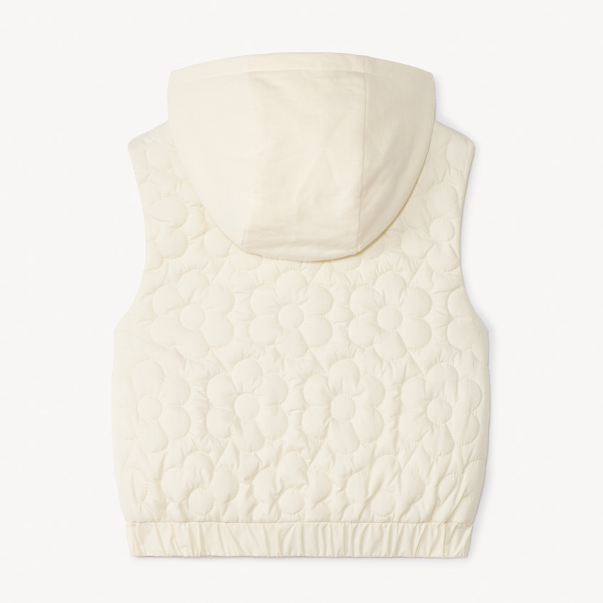 Жилет выполнен из ткани с водоотталкивающим эффектом и украшен красивой стёжкой в форме цветов. Модель дополнена мягким капюшоном из плюшевой ткани и застёжкой на двухцветную молнию с защитой подбородка. Эластичный нижний край обеспечивает удобную посадку. Внутри жилет имеет мягкую трикотажную подкладку, а наполнитель из переработанных материалов помогает сохранять тепло. Внутри воротника расположена фирменная именная бирка с лёгким блеском.