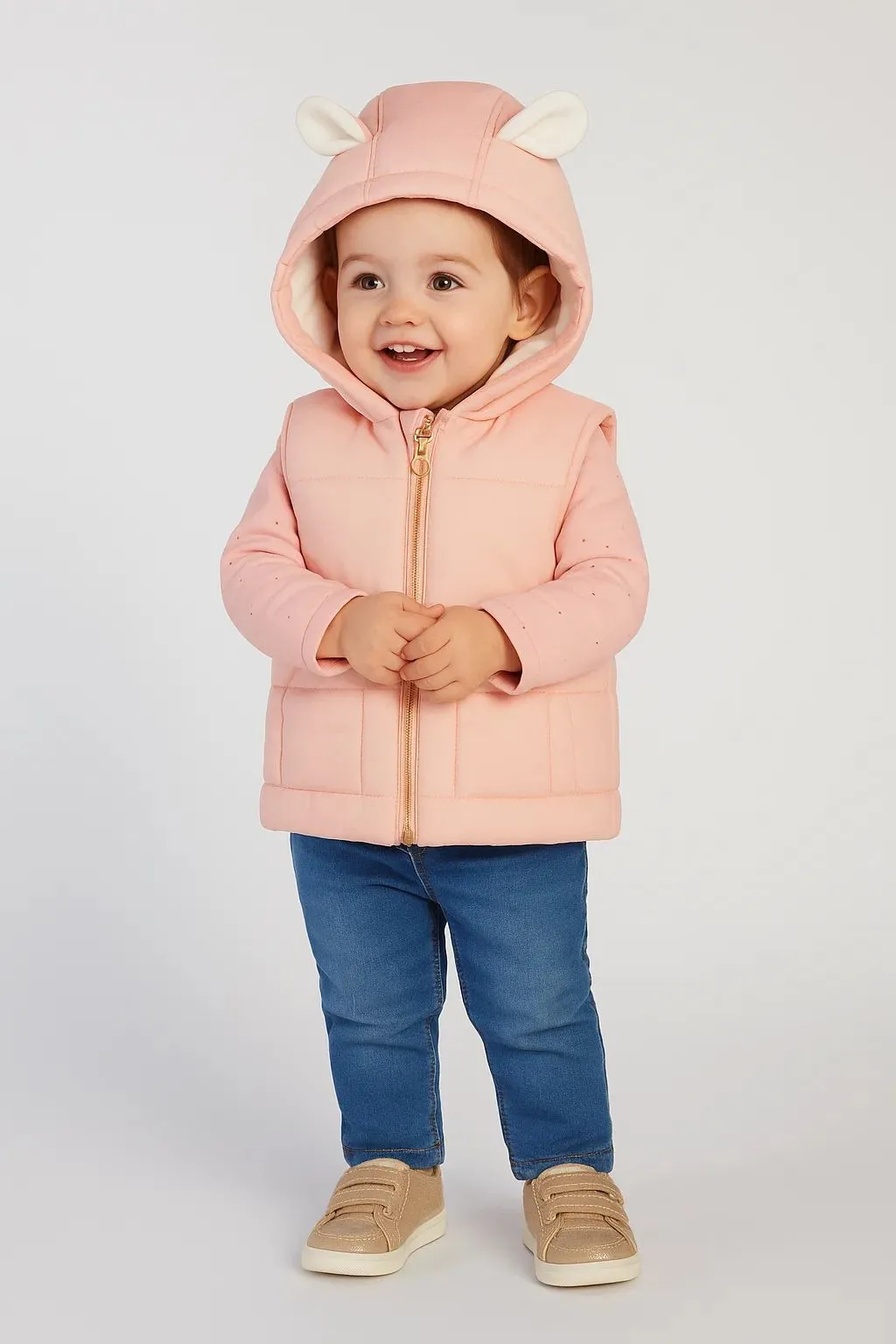 Тёплый и уютный жилет для малышки с забавными ушками на капюшоне, придающими образу игривость и оригинальность. Внешний материал выполнен из прочного 100% полиамида, а контрастная подкладка из мягкого микрофлиса (100% полиэстер) обеспечивает дополнительное тепло.