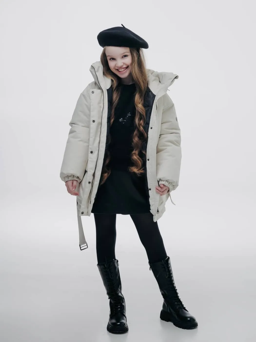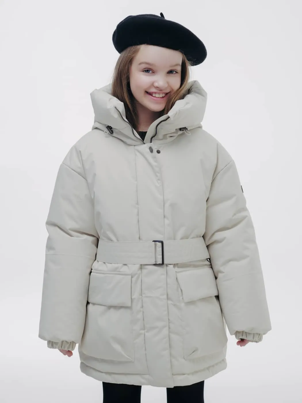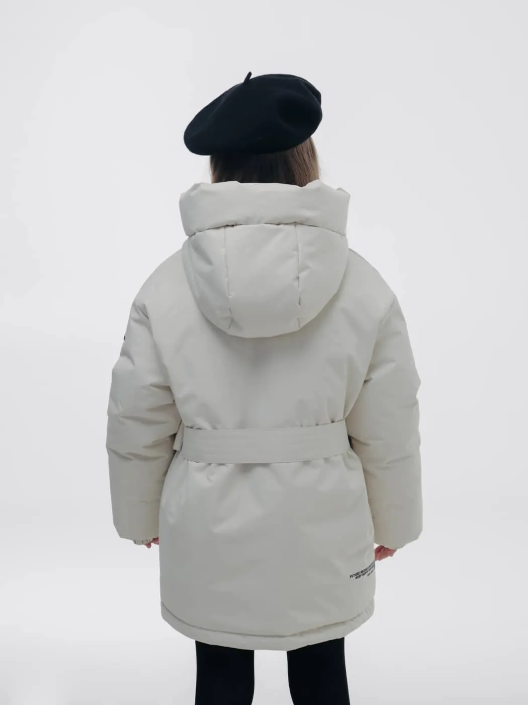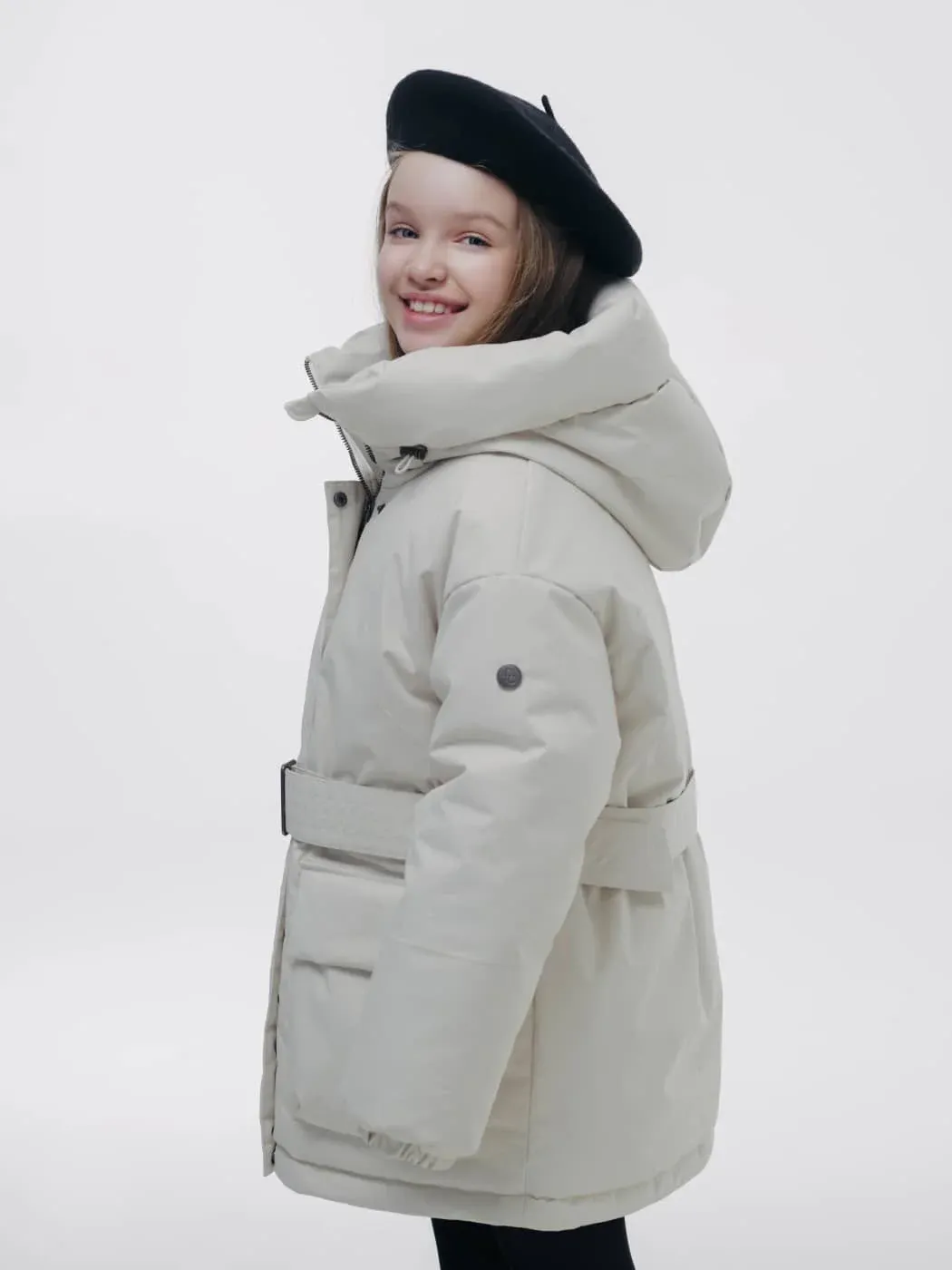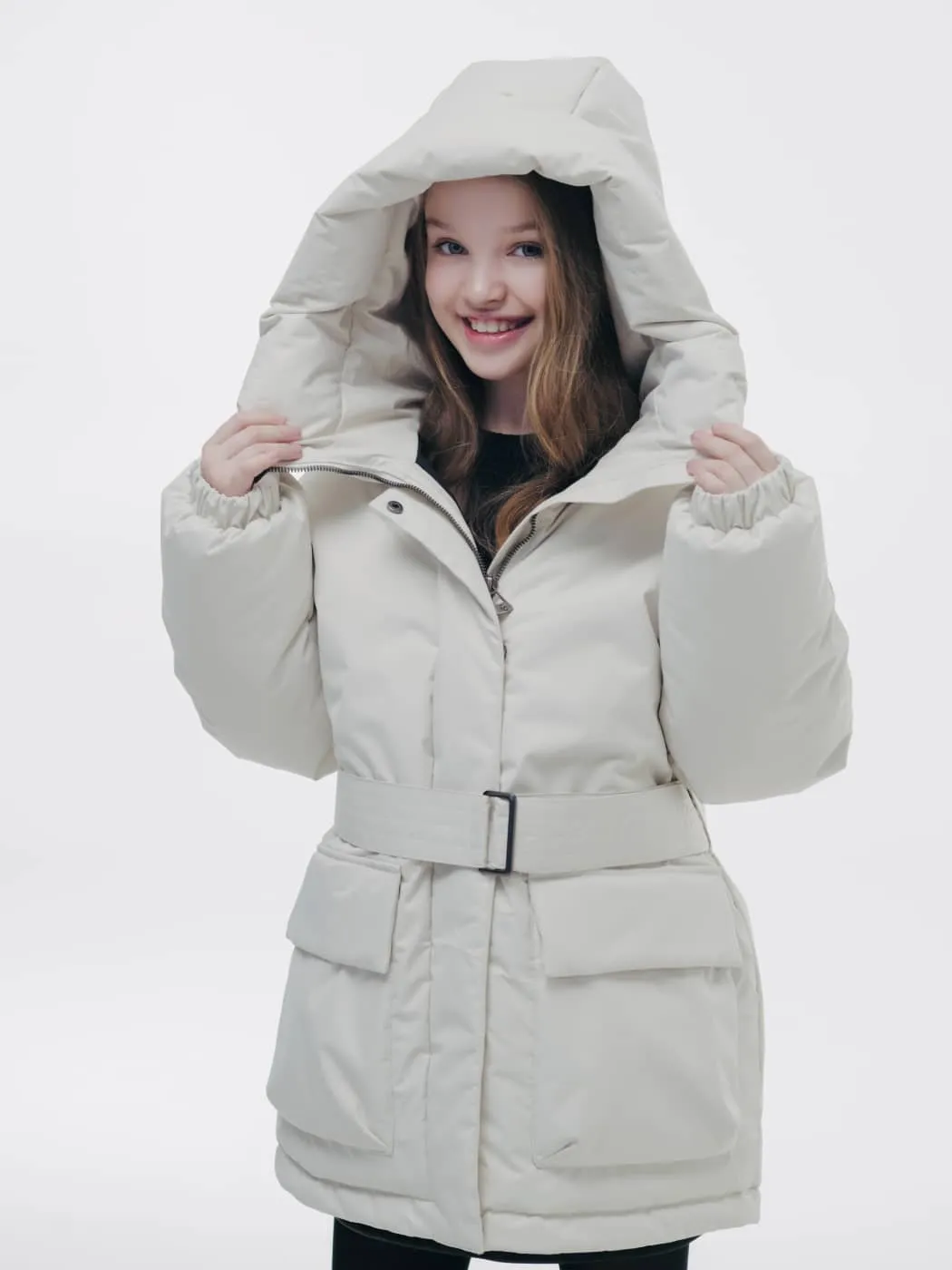 Куртка оснащена глубоким регулируемым капюшоном, объёмными карманами и внутренним карманом, манжетами на резинке и снегозащитным клапаном. Съёмный пояс подчёркивает силуэт, светоотражающие элементы повышают безопасность, а брендированные лямки делают изделие удобным в носке.
