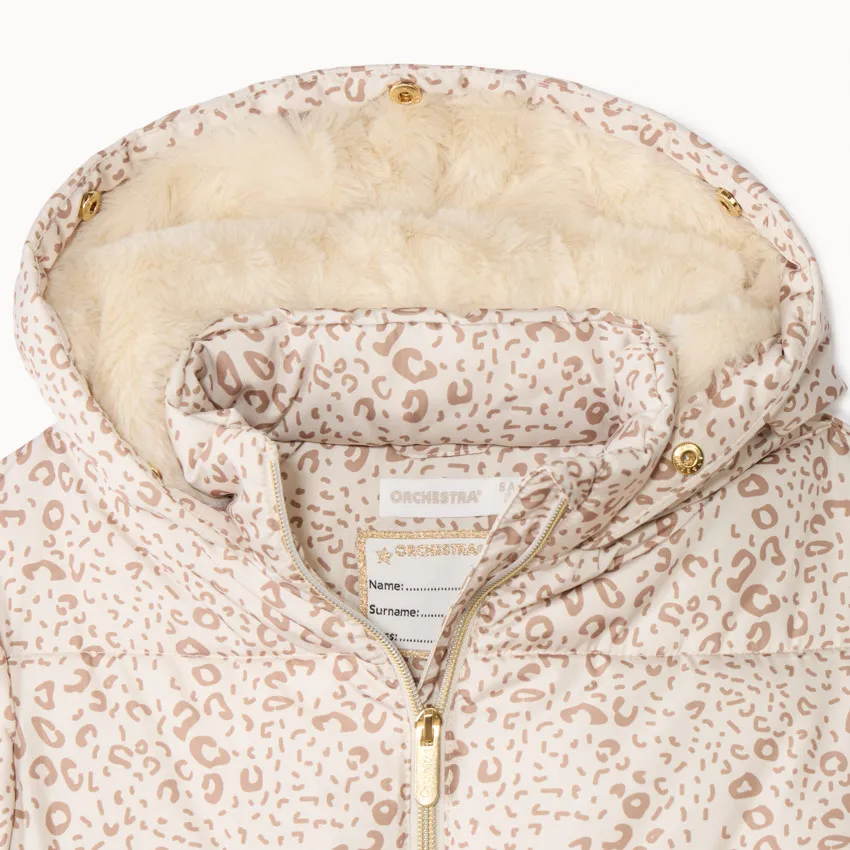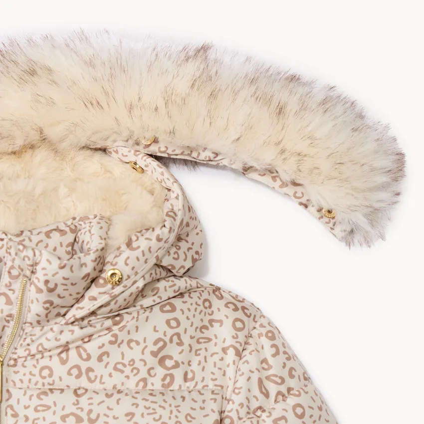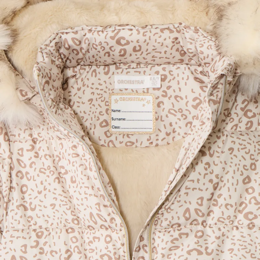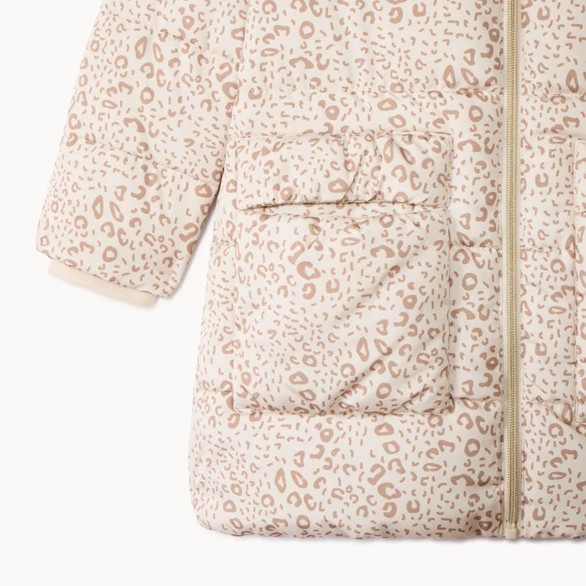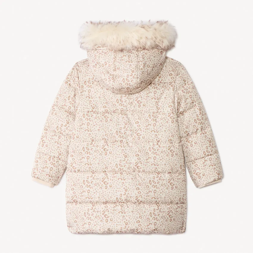 Зимний удлинённый пуховик для девочек — стильная и тёплая модель с леопардовым принтом.