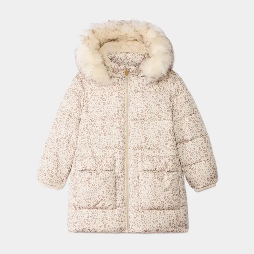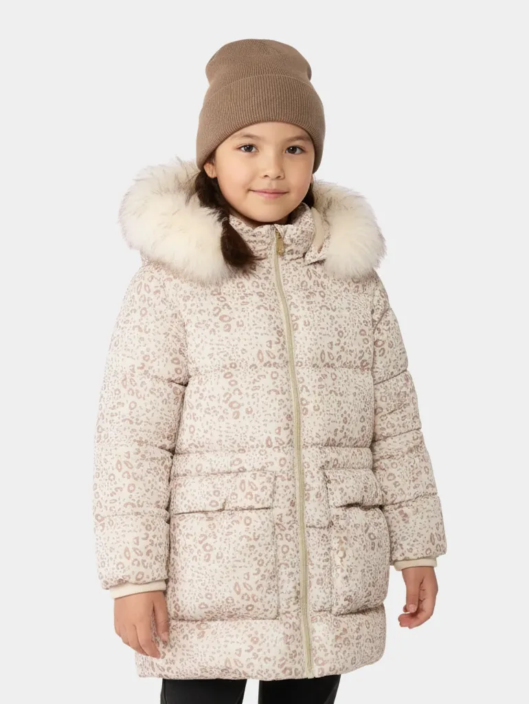 Зимний удлинённый пуховик для девочек — стильная и тёплая модель с леопардовым принтом.