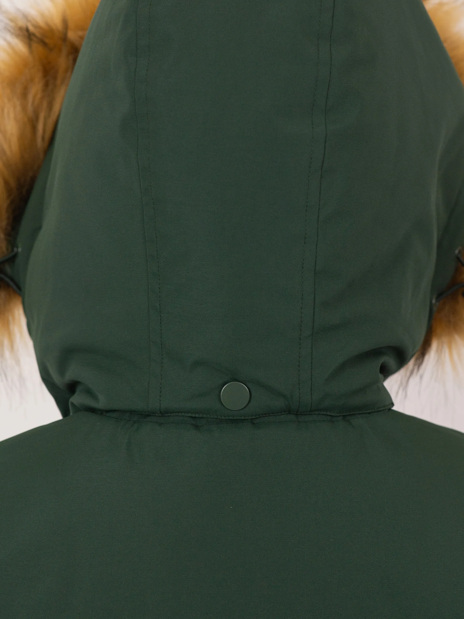 • Безопасный капюшон со съёмным гипоаллергенным мехом и эластичной утяжкой надёжно защищает от ветра и осадков