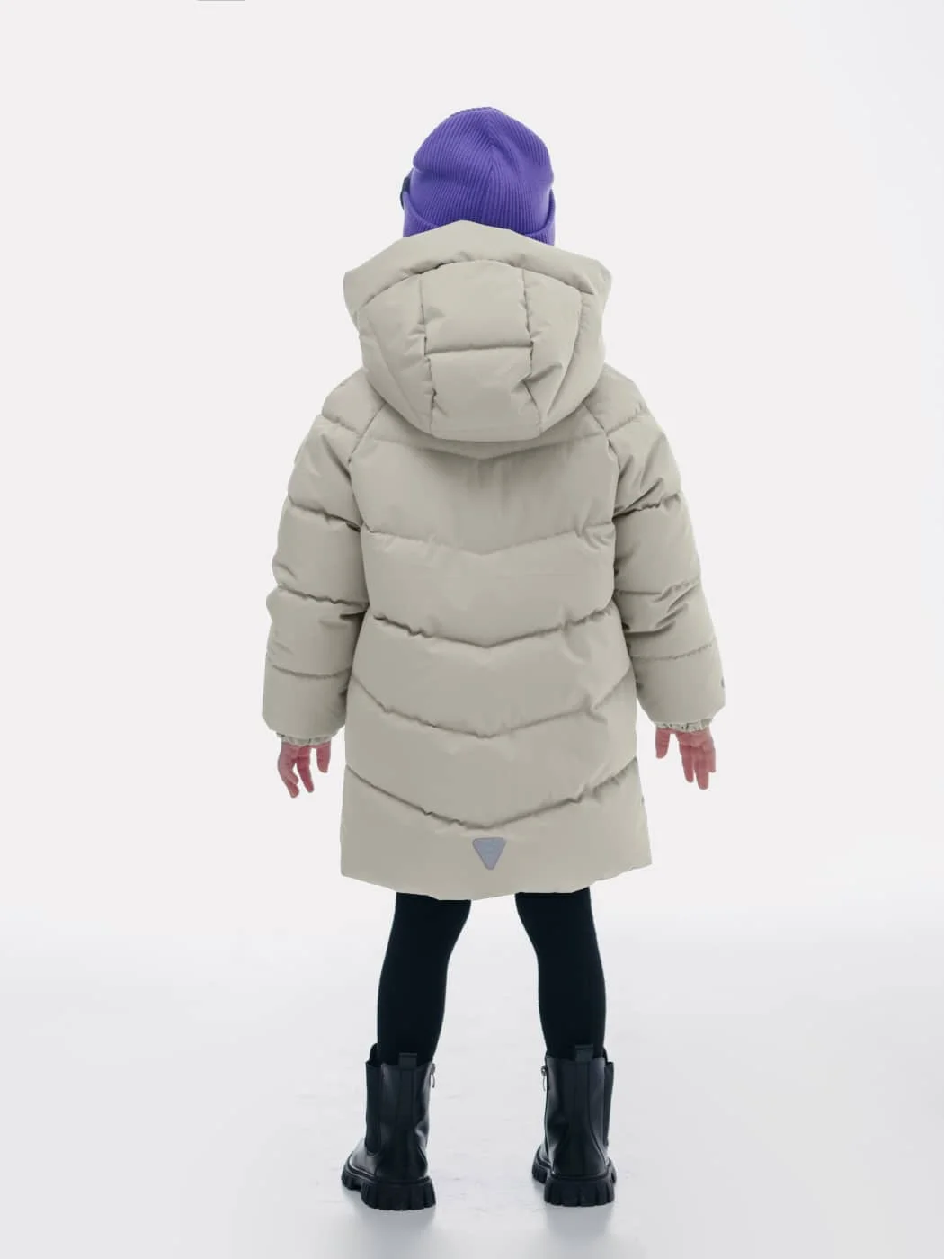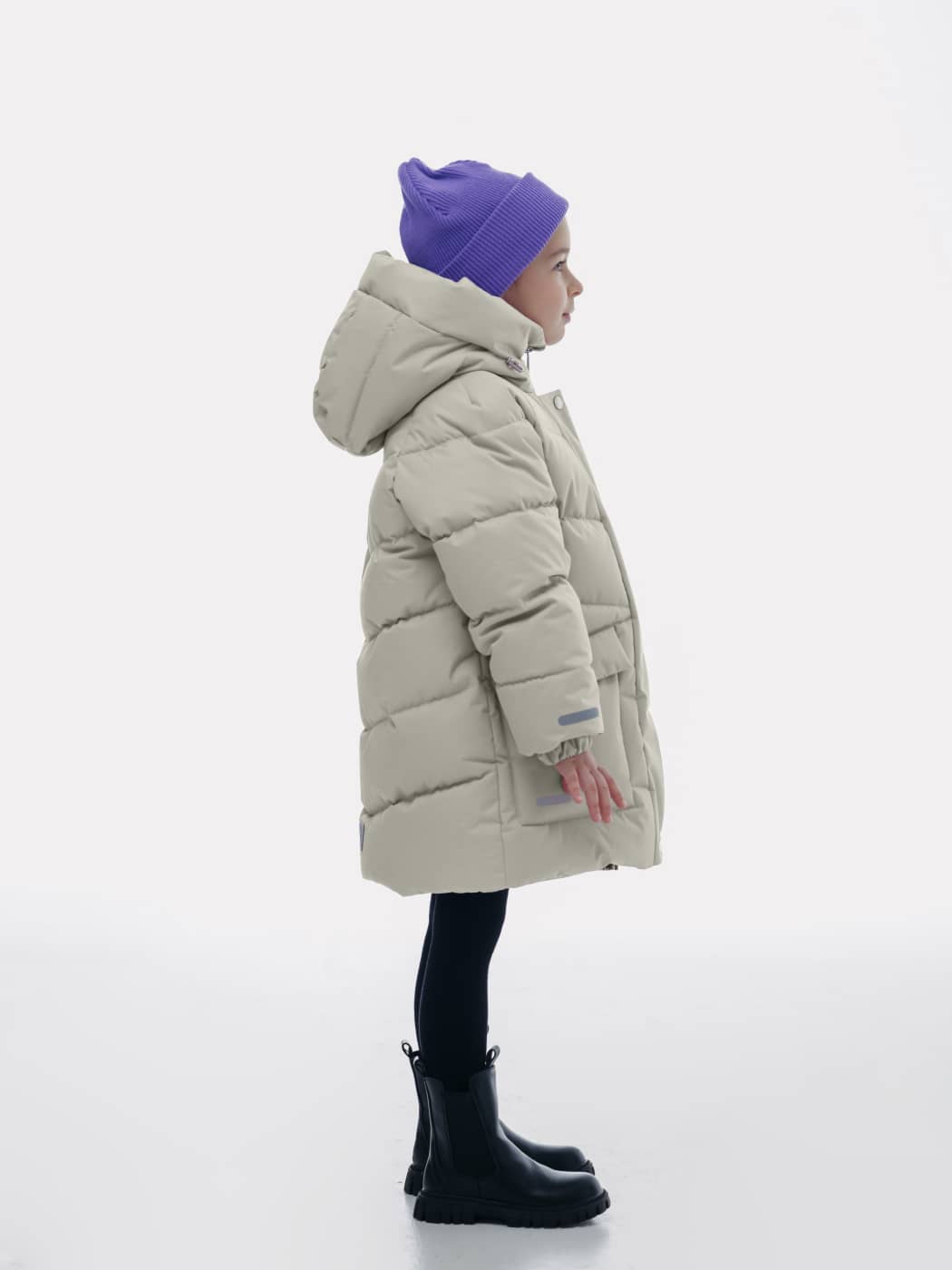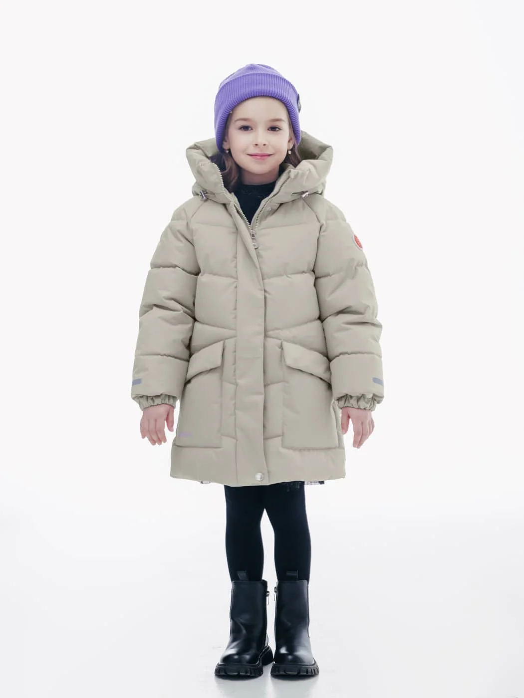 Куртка оснащена глубоким алясочным капюшоном, застёжкой спереди с снегозащитным клапаном, карманами на кнопках, манжетами с резинкой на рукавах, брендированными лямками и светоотражающей наклейкой — всё для удобства и безопасности даже в сильный мороз.