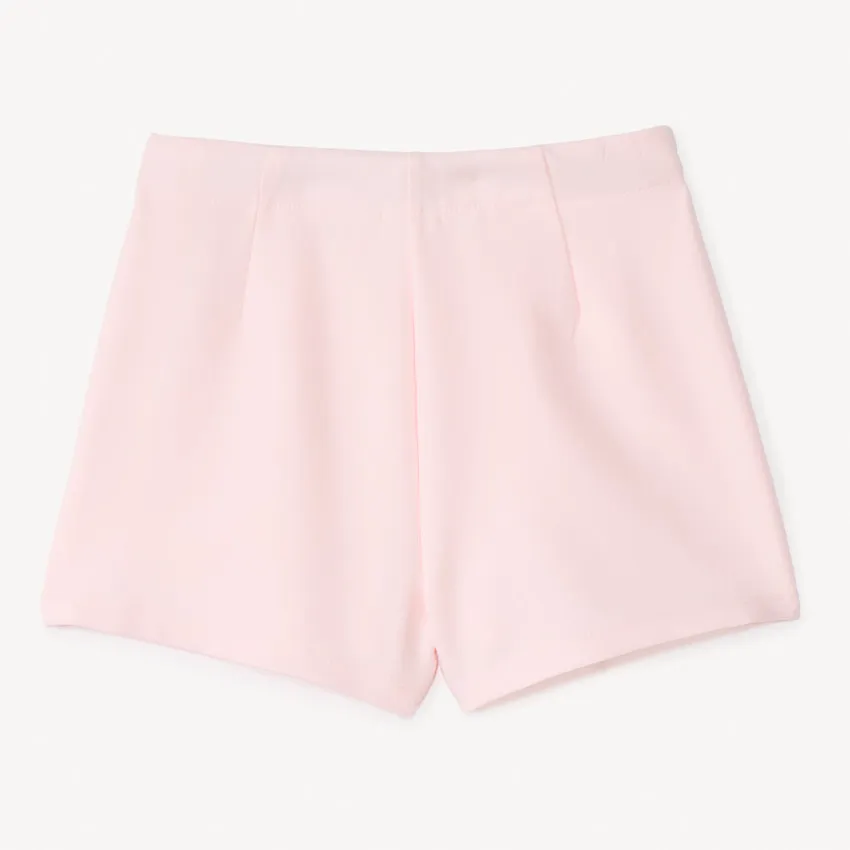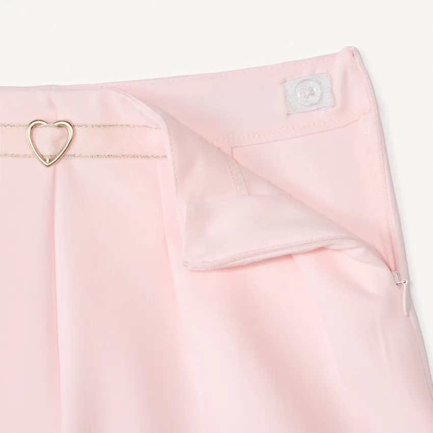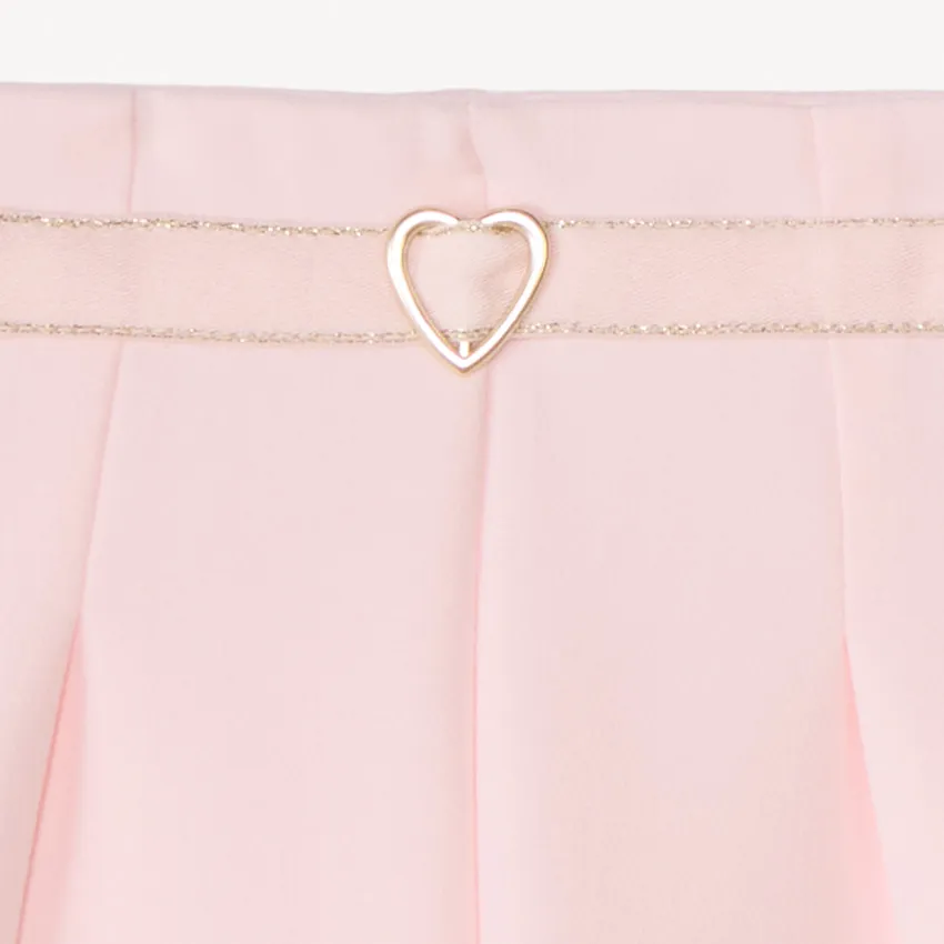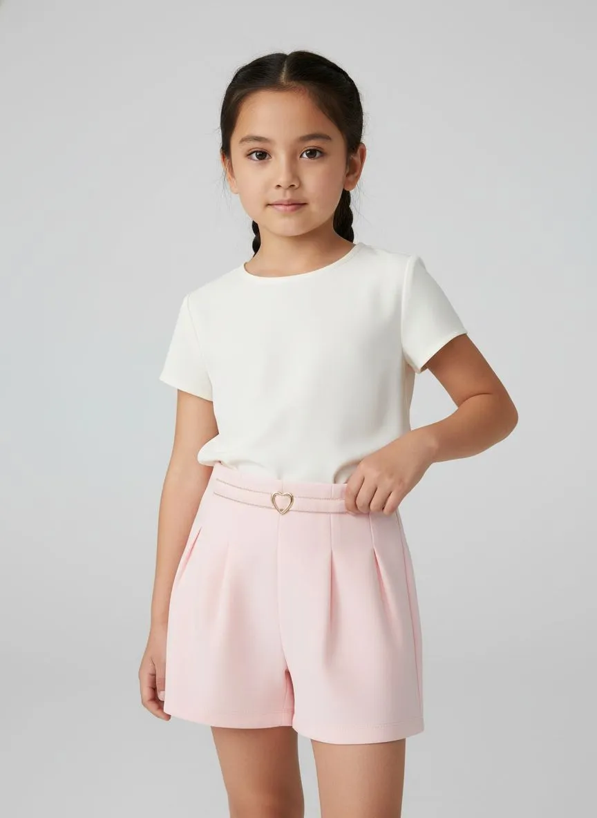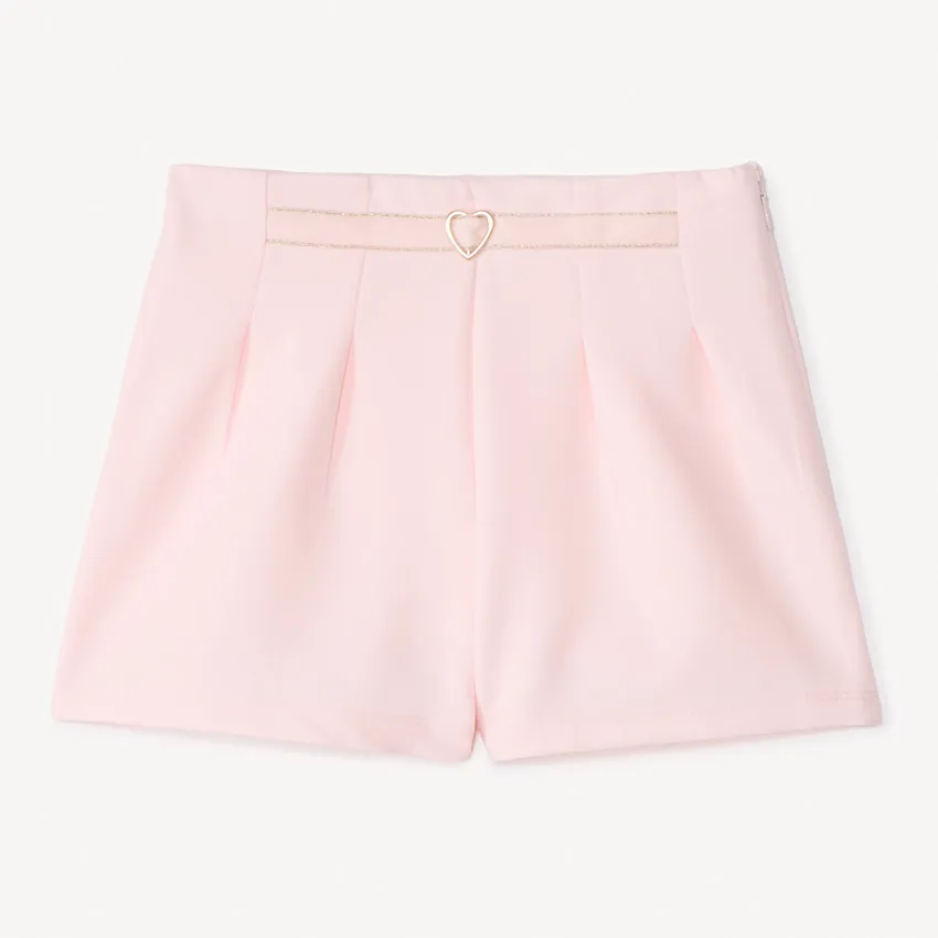 Спереди шорты украшены декоративным поясом с металлическим сердечком по центру. Складки спереди и сзади придают модели аккуратный и стильный силуэт.