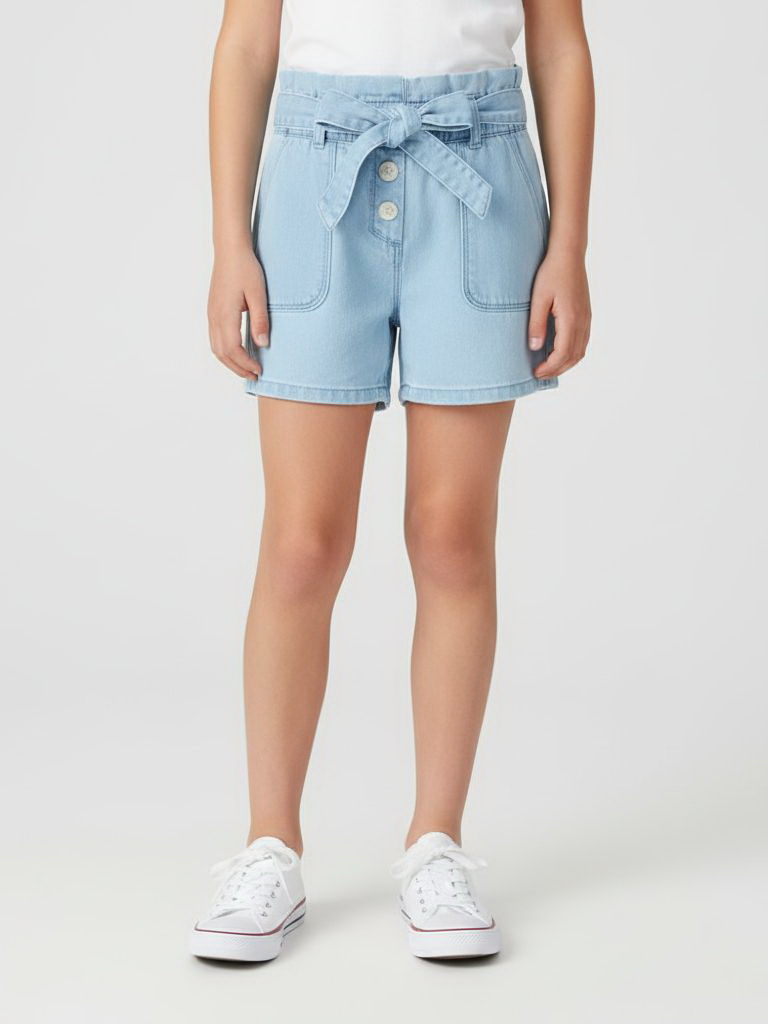 Стильные джинсовые шорты для девочки выполнены из мягкого денима светло-голубого оттенка. Модель имеет модный фасон paperbag с высокой посадкой, который придаёт образу лёгкость и современный вид.