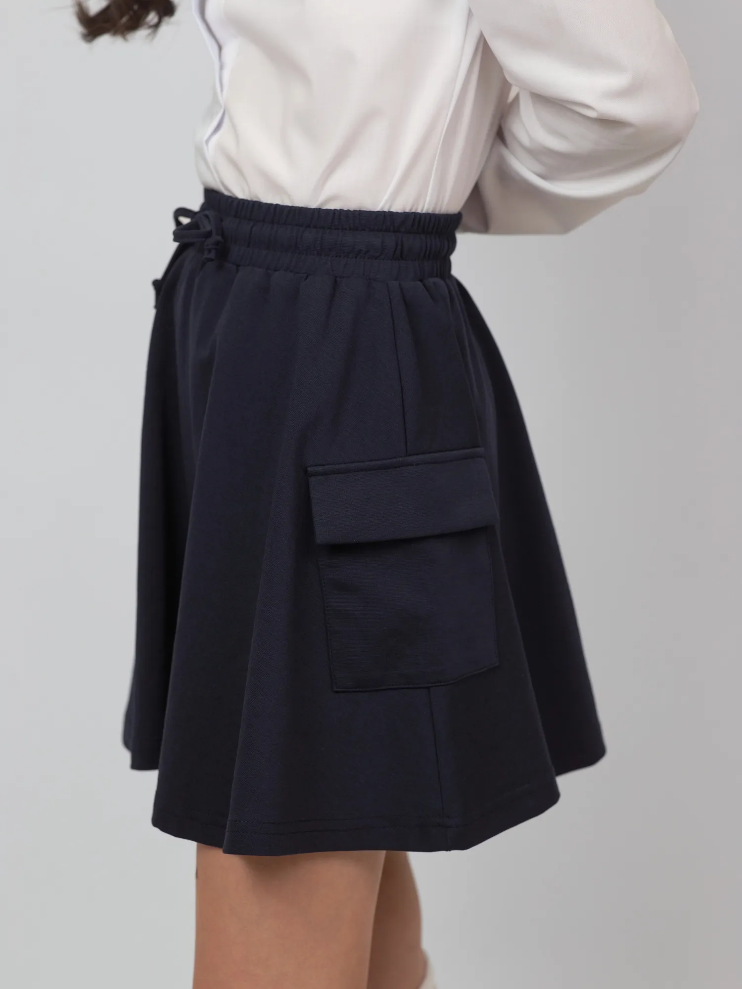 Удобная и стильная школьная юбка, выполнена из мягкой и дышащей ткани (70% хлопок, 24% полиэстер, 6% спандекс). Хлопок делает изделие приятным к телу, полиэстер добавляет прочности, а спандекс — лёгкой эластичности. Пояс на широкой резинке украшен аккуратным бантиком на шнурке, который придаёт образу нежности и девичьего шарма. Отличный выбор для повседневной школьной формы.