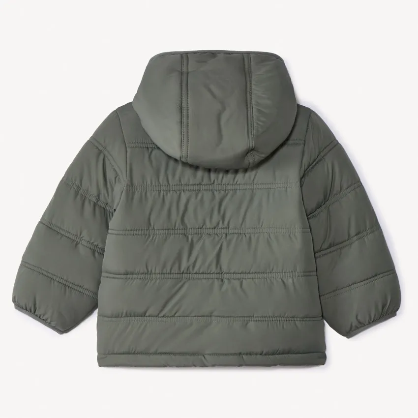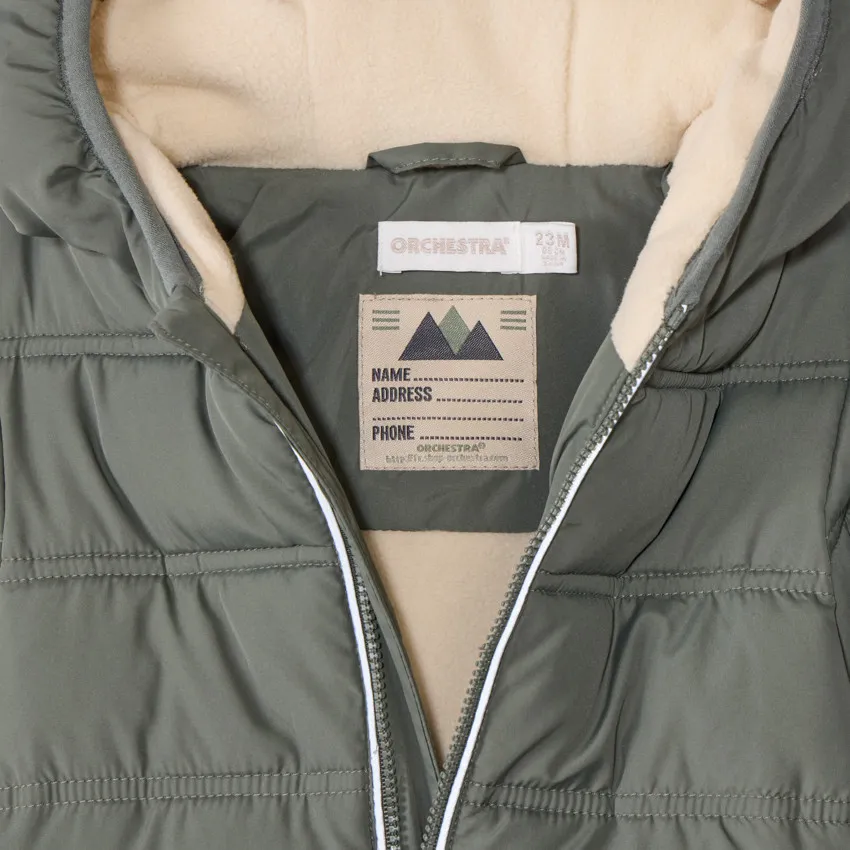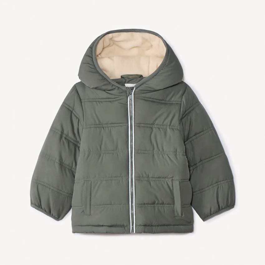 | Куртка из денима с эффектом выцветшего цвета. Контрастный воротник «тедди» серого меланжевого цвета, длинные пышные рукава. Манжеты и низ на эластичной резинке. Спереди застёжка-молния с защитой для подбородка, два кармана «кенгуру». |