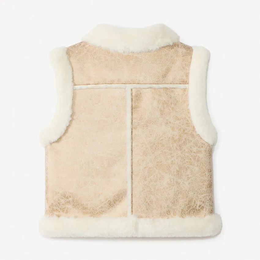 | Утеплённый жилет без рукавов с отделкой из искусственного меха и эффектом серебристого фольгирования. Выполнен из искусственной кожи бежевого цвета с патинированным эффектом. Модель с перекрещенным воротником и застёжкой-молнией, двумя вертикальными прорезными карманами спереди, отделанными искусственным мехом. Проймы и нижний край также украшены меховой отделкой. Внутри — именная нашивка. Спинка однотонная. |