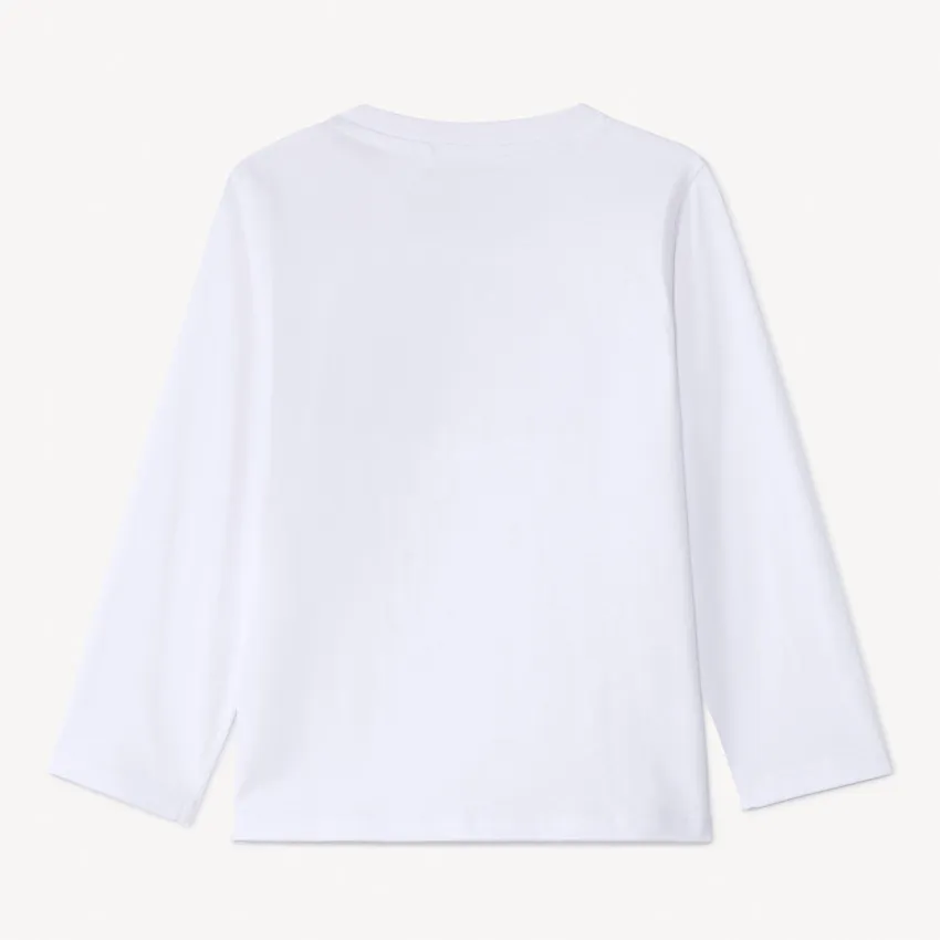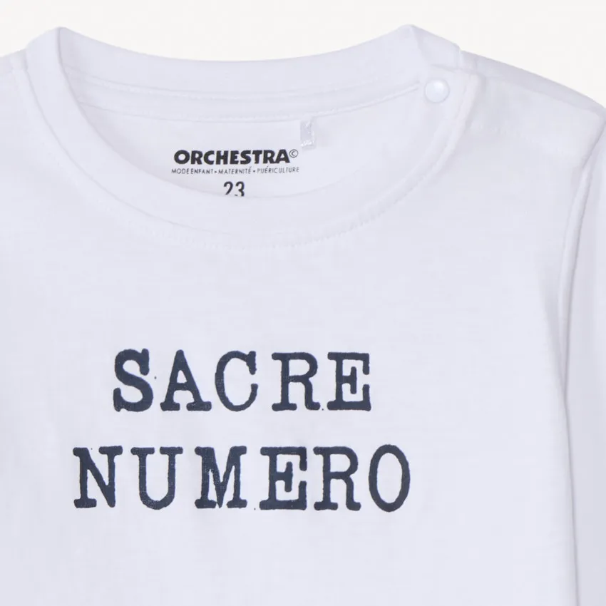 Лонгслив из мягкого трикотажа в белом цвете. Спереди расположен контрастный мягкий принт «Número sagrado», создающий стильный акцент. Модель выполнена с классическим круглым вырезом и удобной застёжкой на кнопке на плече, что облегчает переодевание. Спинка полностью однотонная.