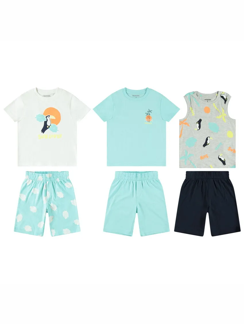 Набор из 3 пижам Orchestra для мальчика — удобный комплект для комфортного сна и отдыха. В набор входят три пижамы, каждая состоит из футболки и шорт. Две футболки с коротким рукавом, одна — без рукавов, что делает комплект практичным для разной погоды. Модели представлены в разных цветах и с разными принтами, позволяя разнообразить домашний гардероб ребёнка. Шорты дополнены эластичным поясом на резинке, обеспечивающим удобную посадку. Состав: 100% хлопок — мягкая, дышащая и приятная к коже ткань, обеспечивающая комфорт во время сна.