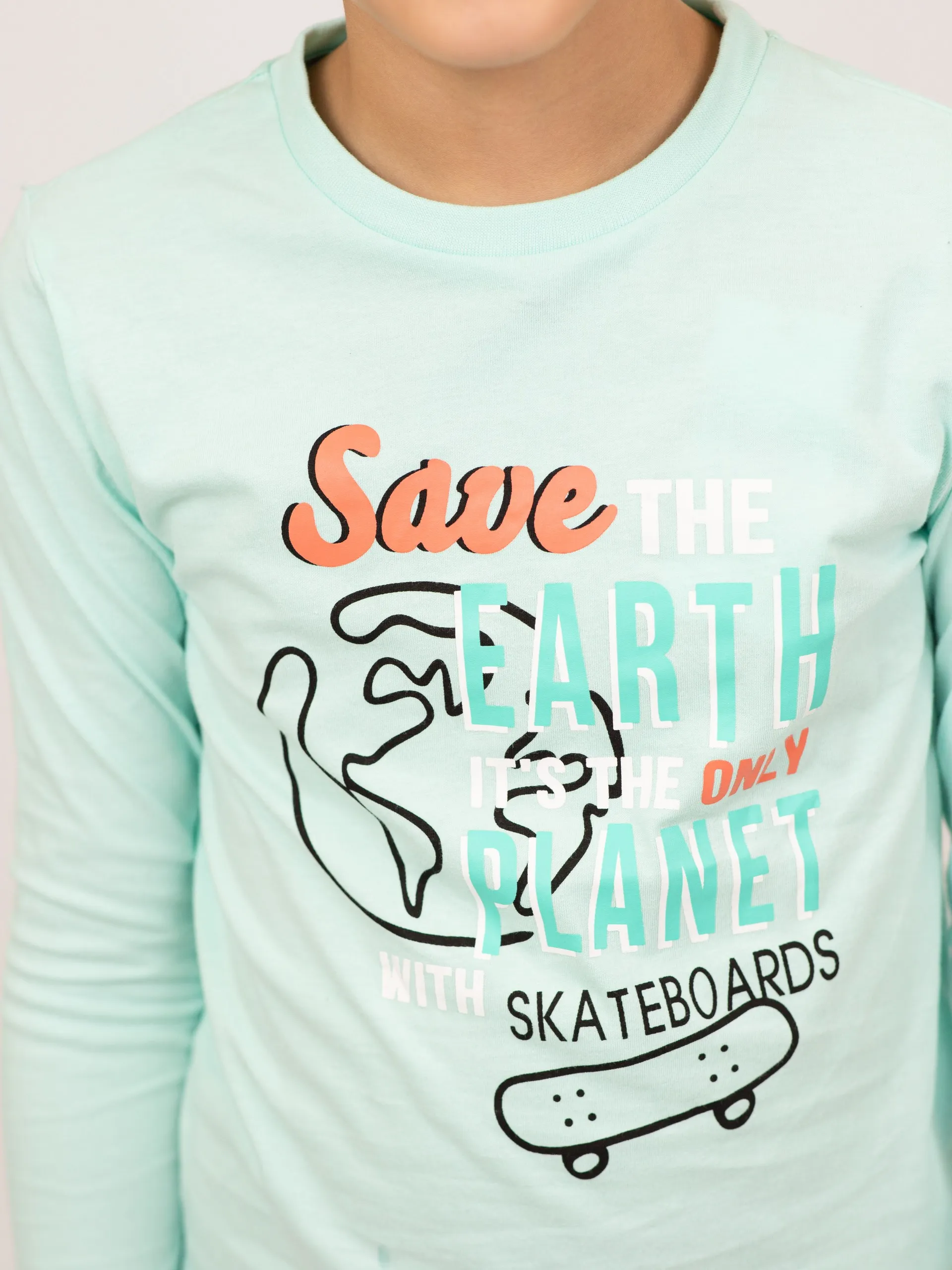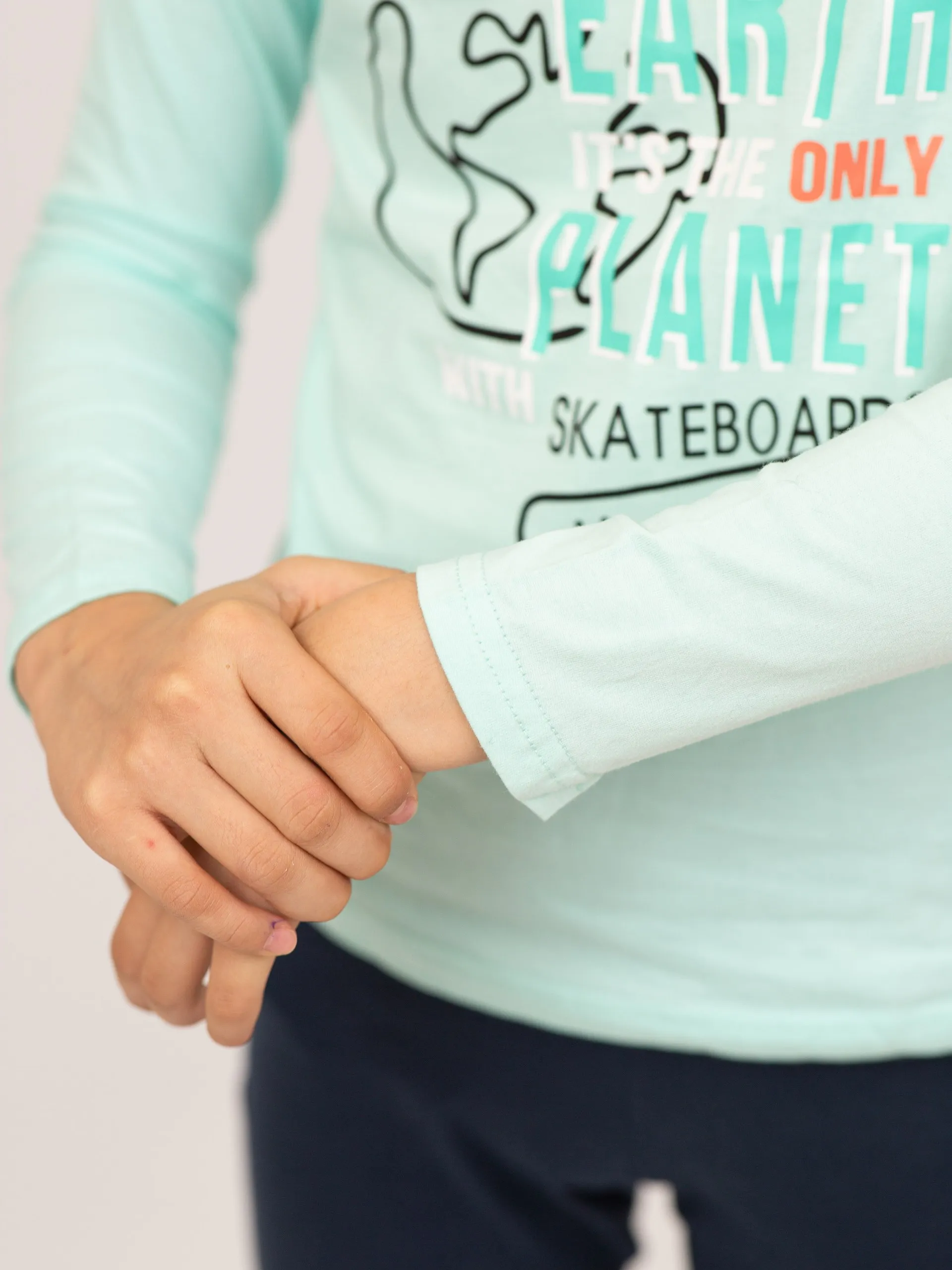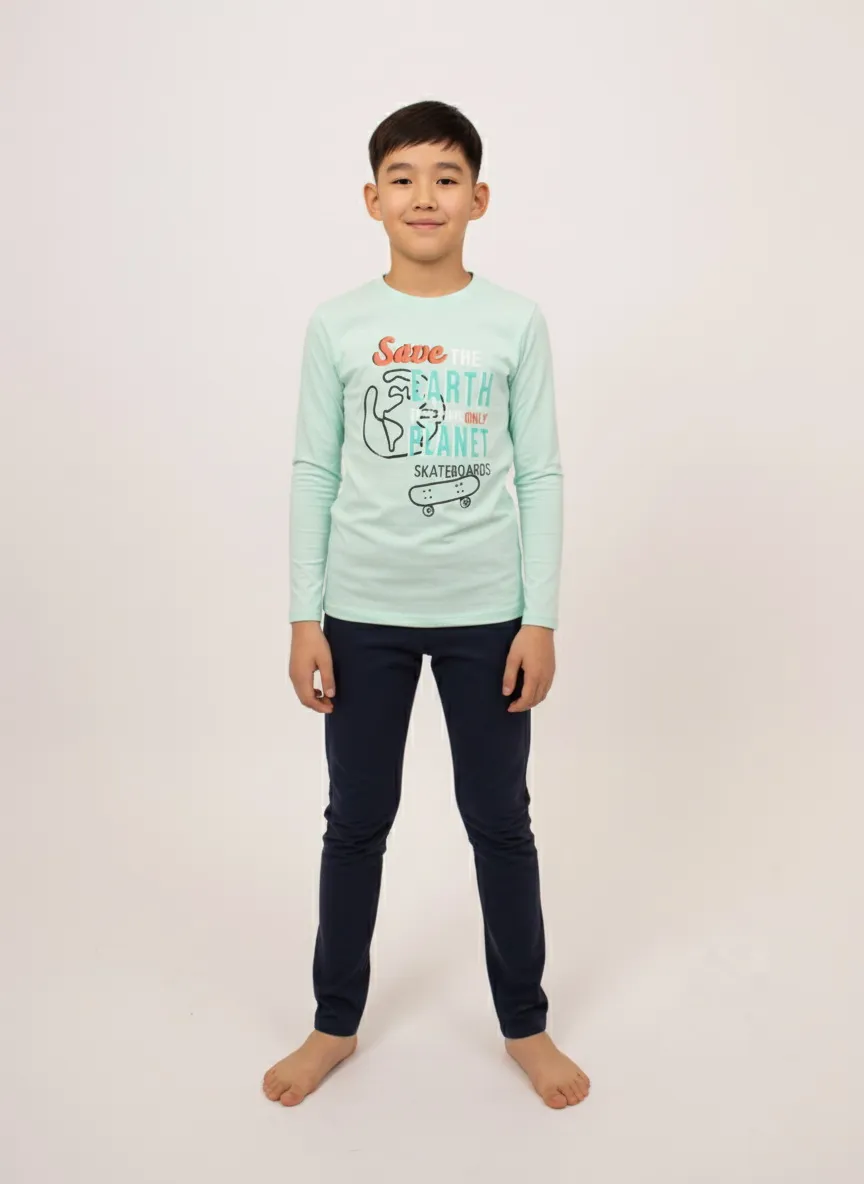 | Пижама для мальчика из мягкого хлопка создана для максимального комфорта и свободы движений. Лонгслив с длинными рукавами украшен ярким принтом “Save the Earth — it’s the only planet”, вдохновляющим заботиться о природе. Брюки на мягком эластичном поясе обеспечивают удобную посадку и не сковывают во время сна. Дышащая ткань приятна к телу, идеально подходит для ночного отдыха и домашних игр. |