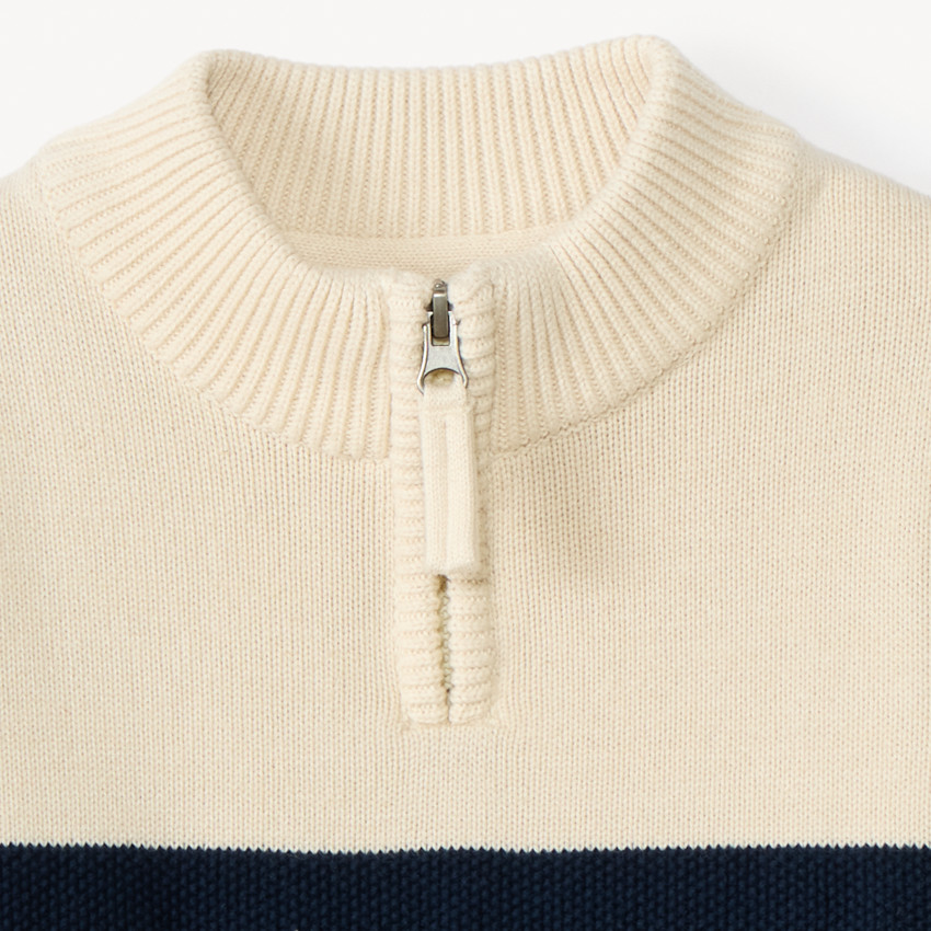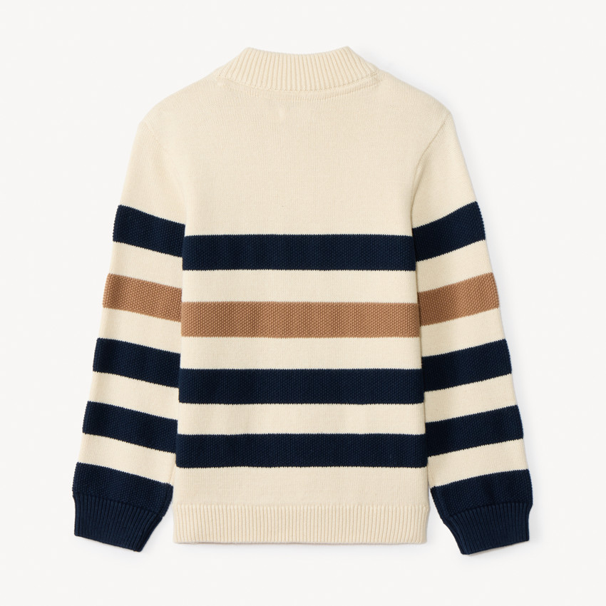 | Джемпер из трикотажа с длинными рукавами и контрастными полосами по всей поверхности. Модель выполнена с воротником «поло» на молнии из эластичного трикотажа. Манжеты и нижний край также выполнены из плотного эластичного трикотажа, обеспечивающего комфортную посадку и сохранение формы. |