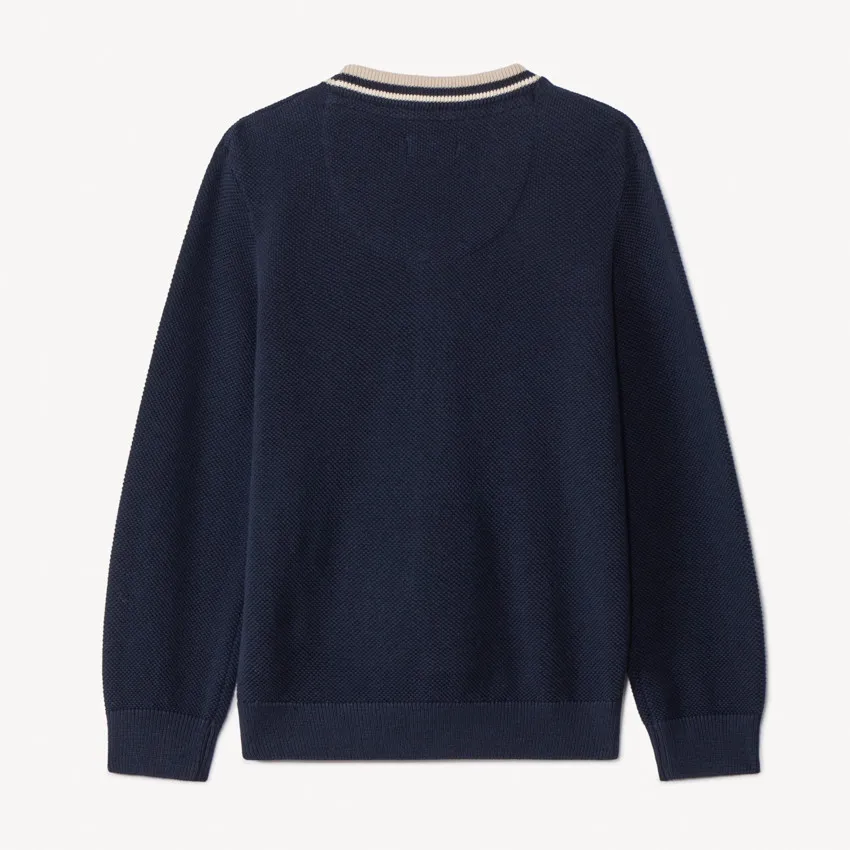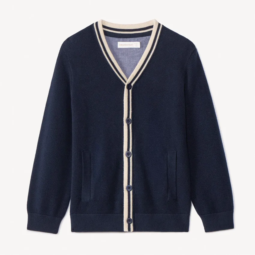 | Кардиган фасонной вязки для мальчиков. Однотонный тёмно-синий цвет. V-образный вырез с контрастной резинкой на горловине и по низу изделия. Застёжка на пуговицы спереди. Два кармана-реглан. Эластичные манжеты и подол с ребристой отделкой. Внутренняя часть воротника выполнена из ткани шамбре. Удобная и универсальная модель для школы и повседневной носки. |