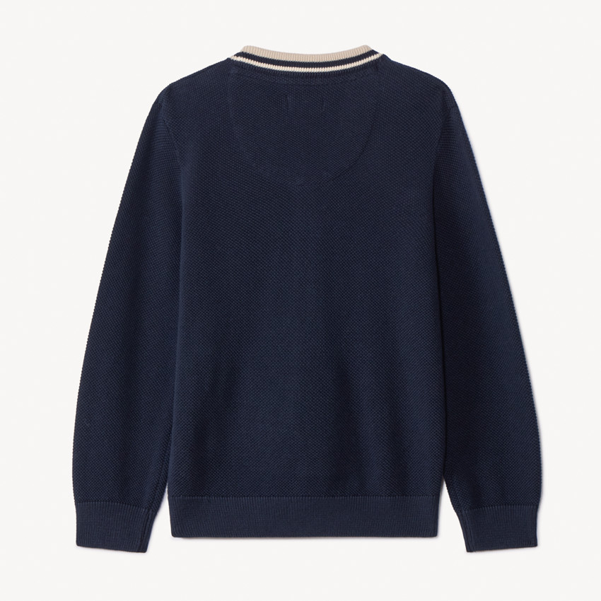 Кардиган фасонной вязки для мальчиков. Однотонный тёмно-синий цвет. V-образный вырез с контрастной резинкой на горловине и по низу изделия. Застёжка на пуговицы спереди. Два кармана-реглан. Эластичные манжеты и подол с ребристой отделкой. Внутренняя часть воротника выполнена из ткани шамбре. Удобная и универсальная модель для школы и повседневной носки.