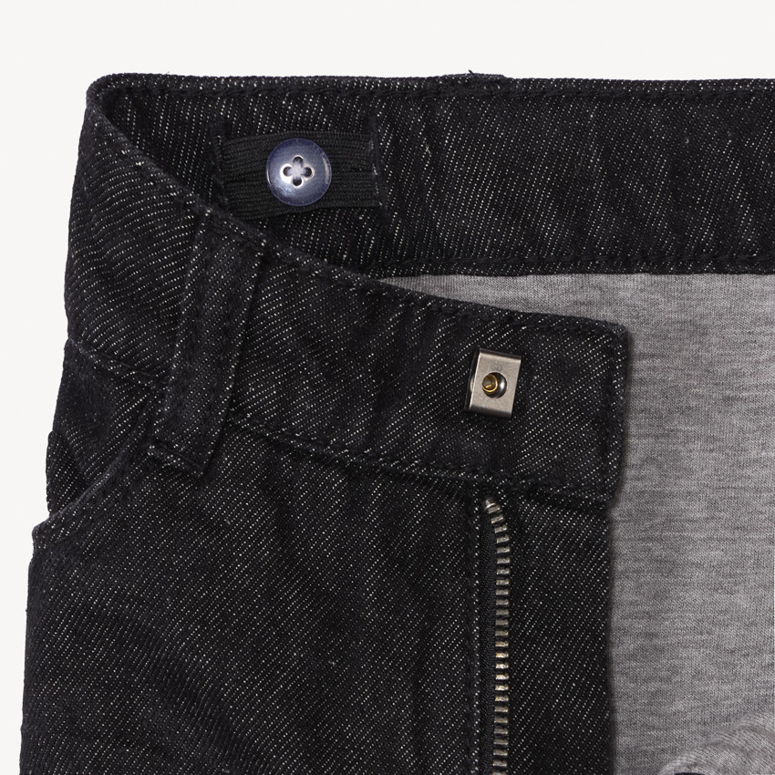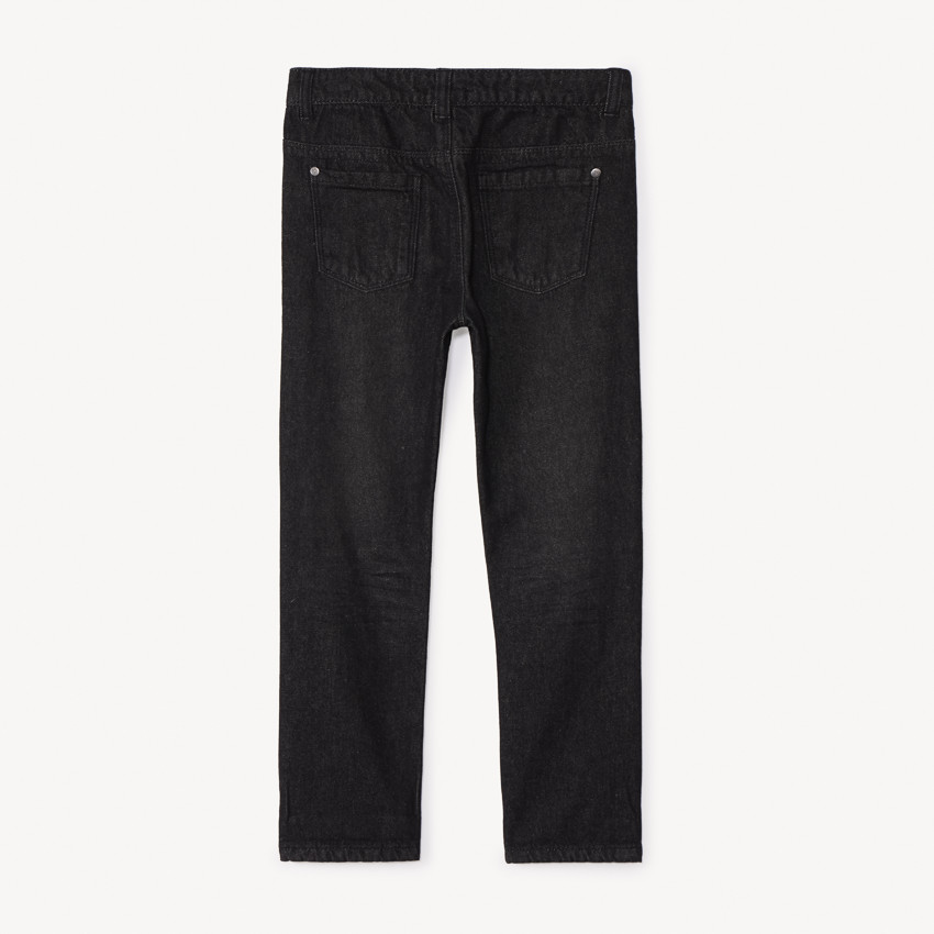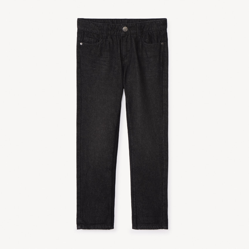Прямые джинсы однотонного цвета с петлями для пояса. Спереди застёжка на кнопку и молнию, два косых кармана и маленький карман. Сзади два накладных кармана. Внутренняя часть с подкладкой из трикотажа.