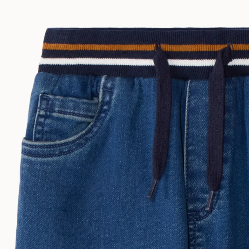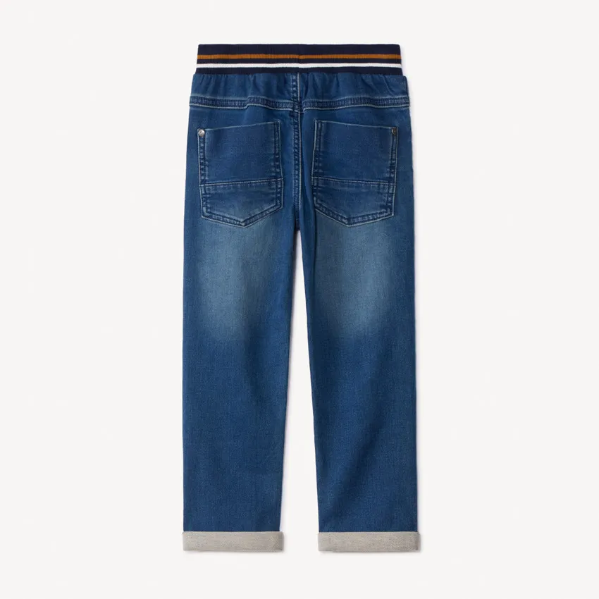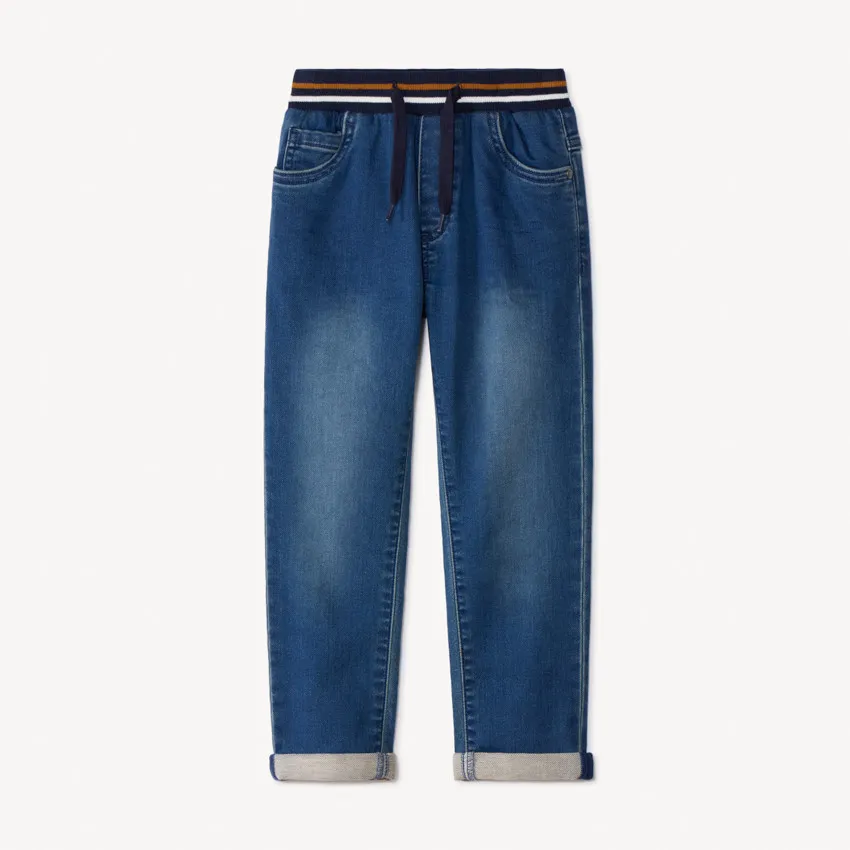 Джинсы для мальчиков с эластичным поясом и регулируемым шнурком в контрастном цвете. Спереди — два прорезных кармана, сзади — два накладных. Удобная и универсальная модель для школы, прогулок и активного отдыха.