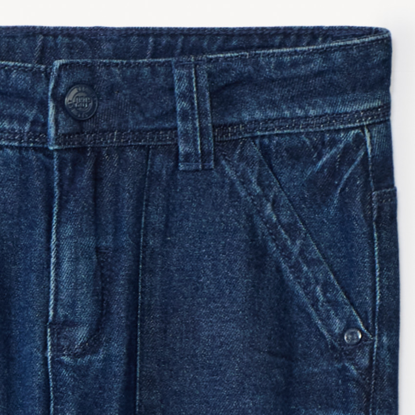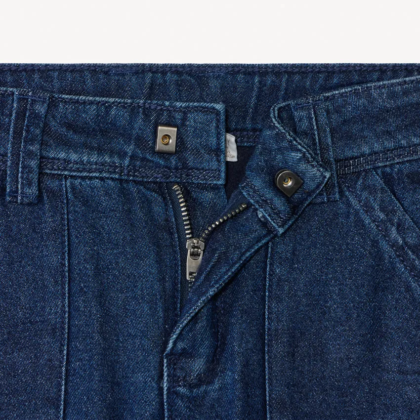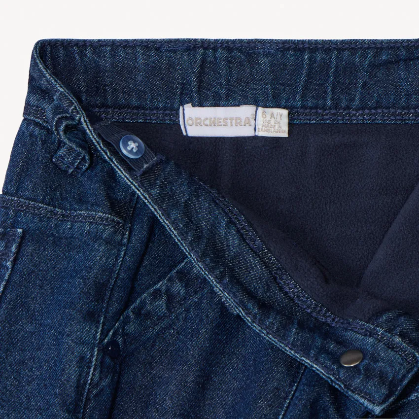 | Джинсы прямого кроя синего цвета. Пояс регулируется изнутри и дополнен шлёвками снаружи. Спереди — застёжка на пуговицу и молнию, два итальянских кармана и декоративный дамасский эффект на области бёдер. Сзади — два накладных кармана и волнистая отделка в области коленей. Низ брюк регулируется по ширине. Внутренняя подкладка из микрофлиса в тон основной ткани обеспечивает дополнительное тепло и комфорт. |