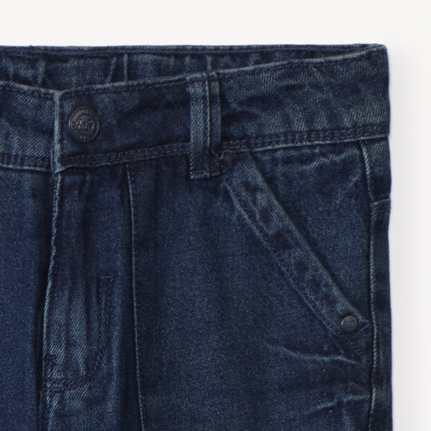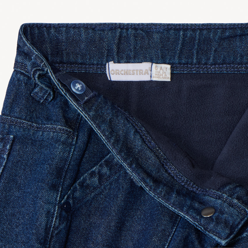 Джинсы прямого кроя синего цвета. Пояс регулируется изнутри и дополнен шлёвками снаружи. Спереди — застёжка на пуговицу и молнию, два итальянских кармана и декоративный дамасский эффект на области бёдер. Сзади — два накладных кармана и волнистая отделка в области коленей. Низ брюк регулируется по ширине. Внутренняя подкладка из микрофлиса в тон основной ткани обеспечивает дополнительное тепло и комфорт.