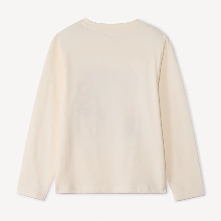 Футболка с длинными рукавами из мягкого трикотажа цвета экрю. Спереди принт с персонажами Cars Disney, тканевая бирка и вышивка с объёмным эффектом. Круглый вырез горловины, спинка однотонная.