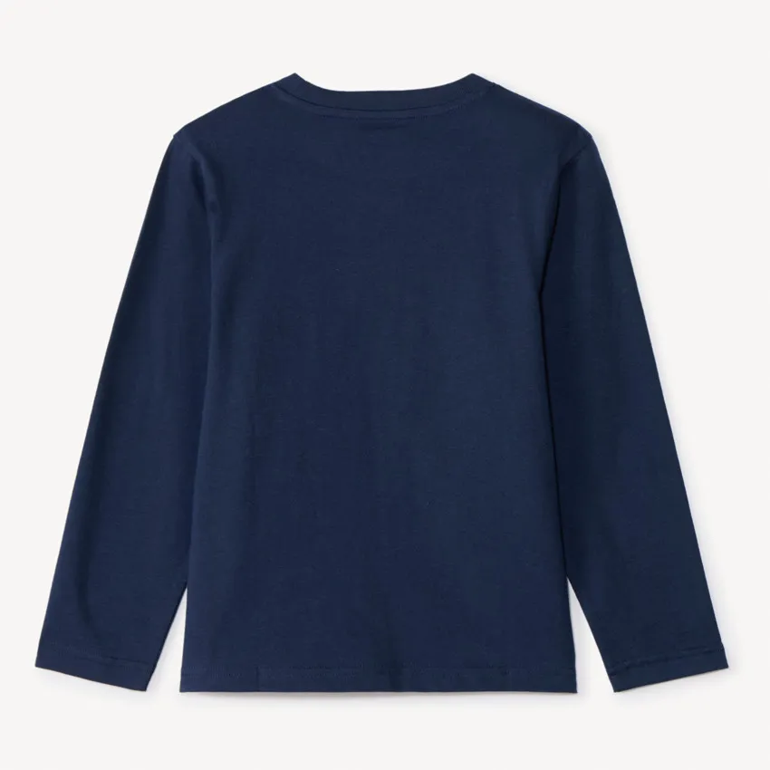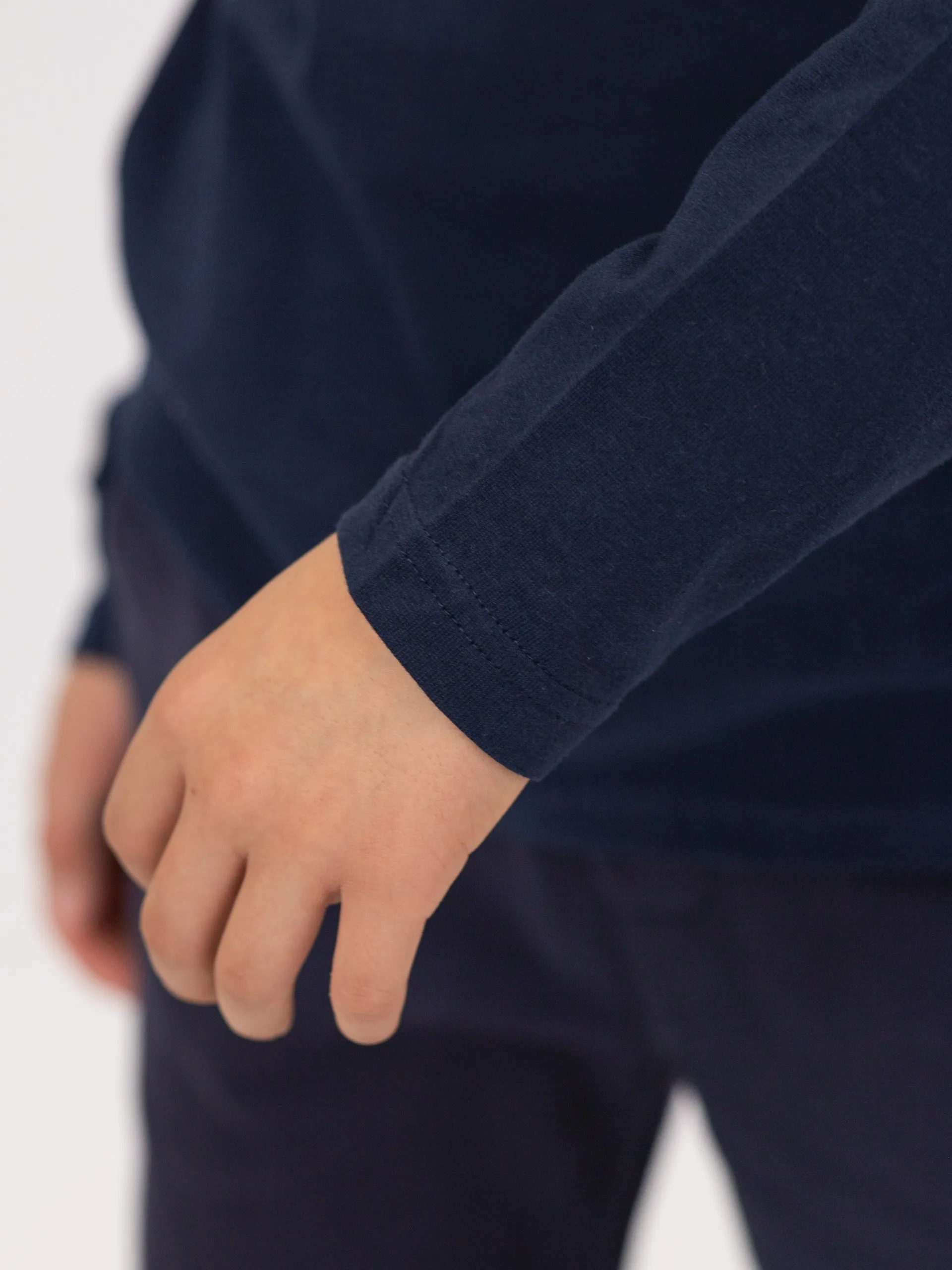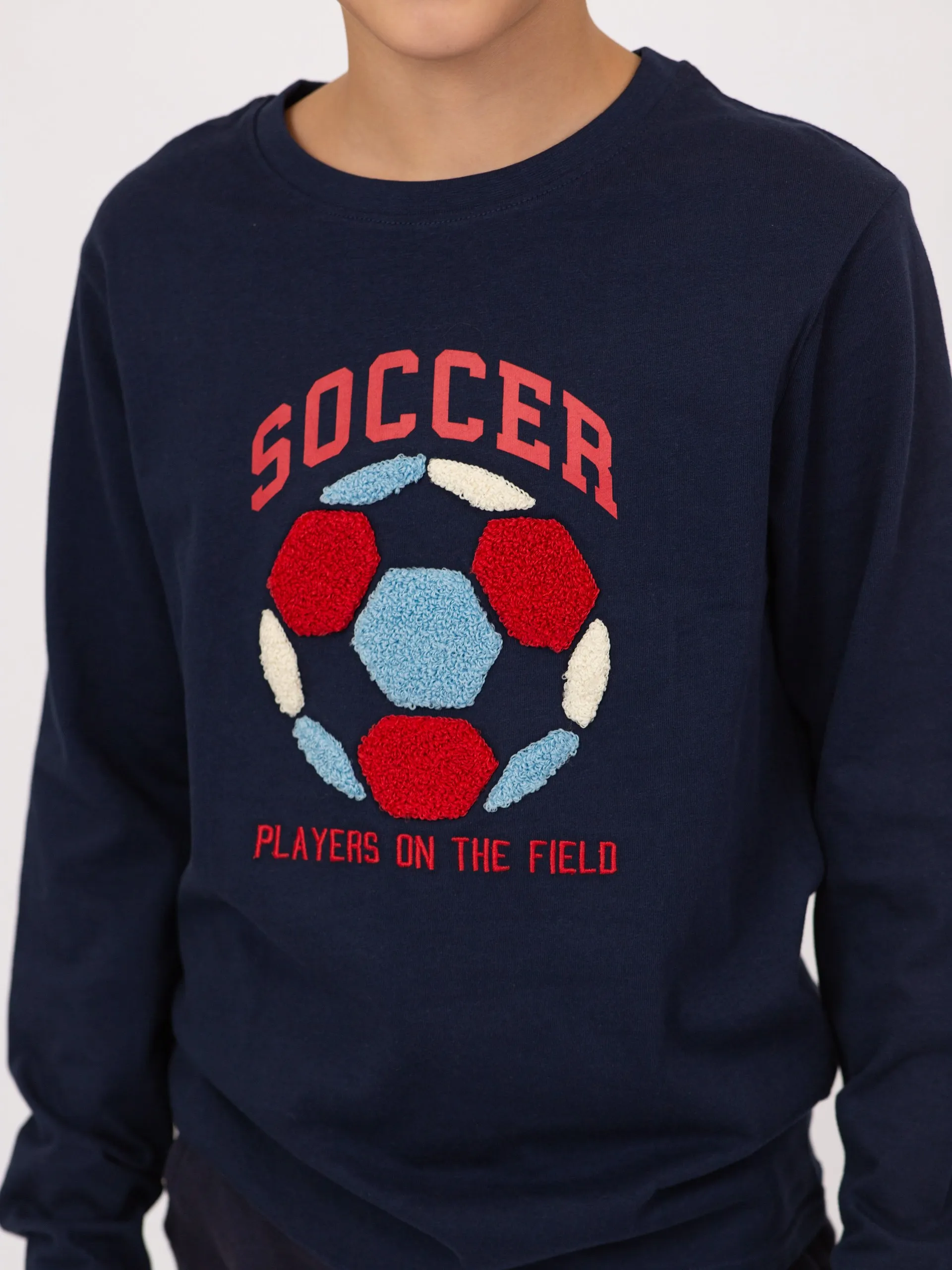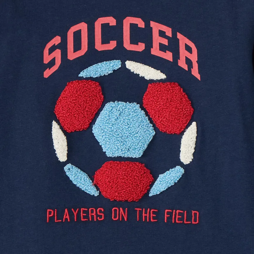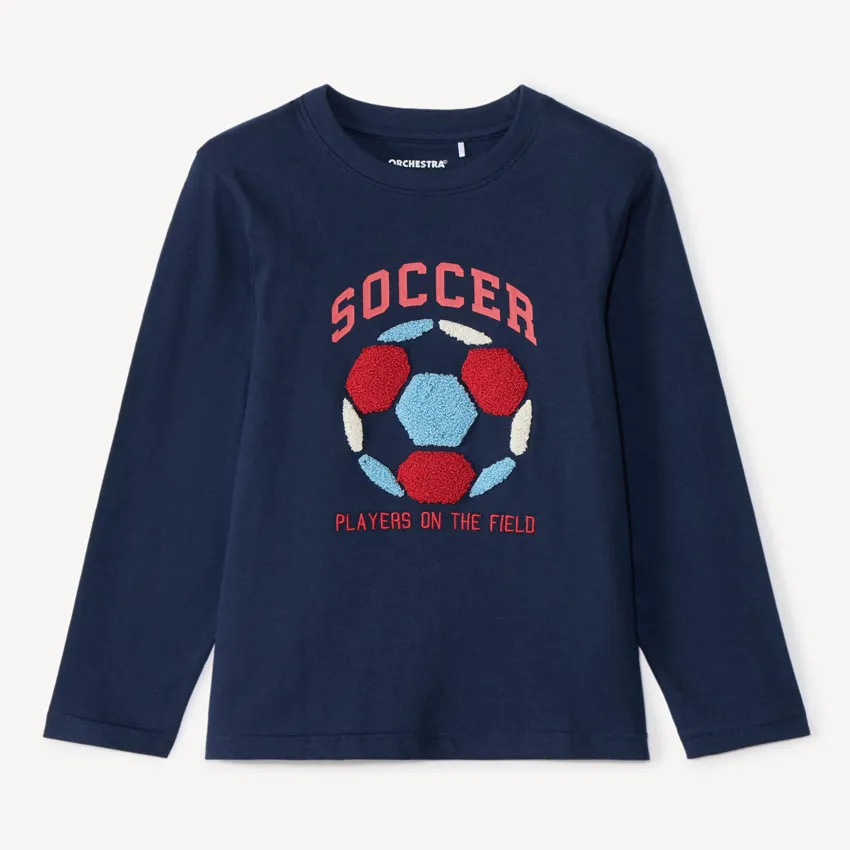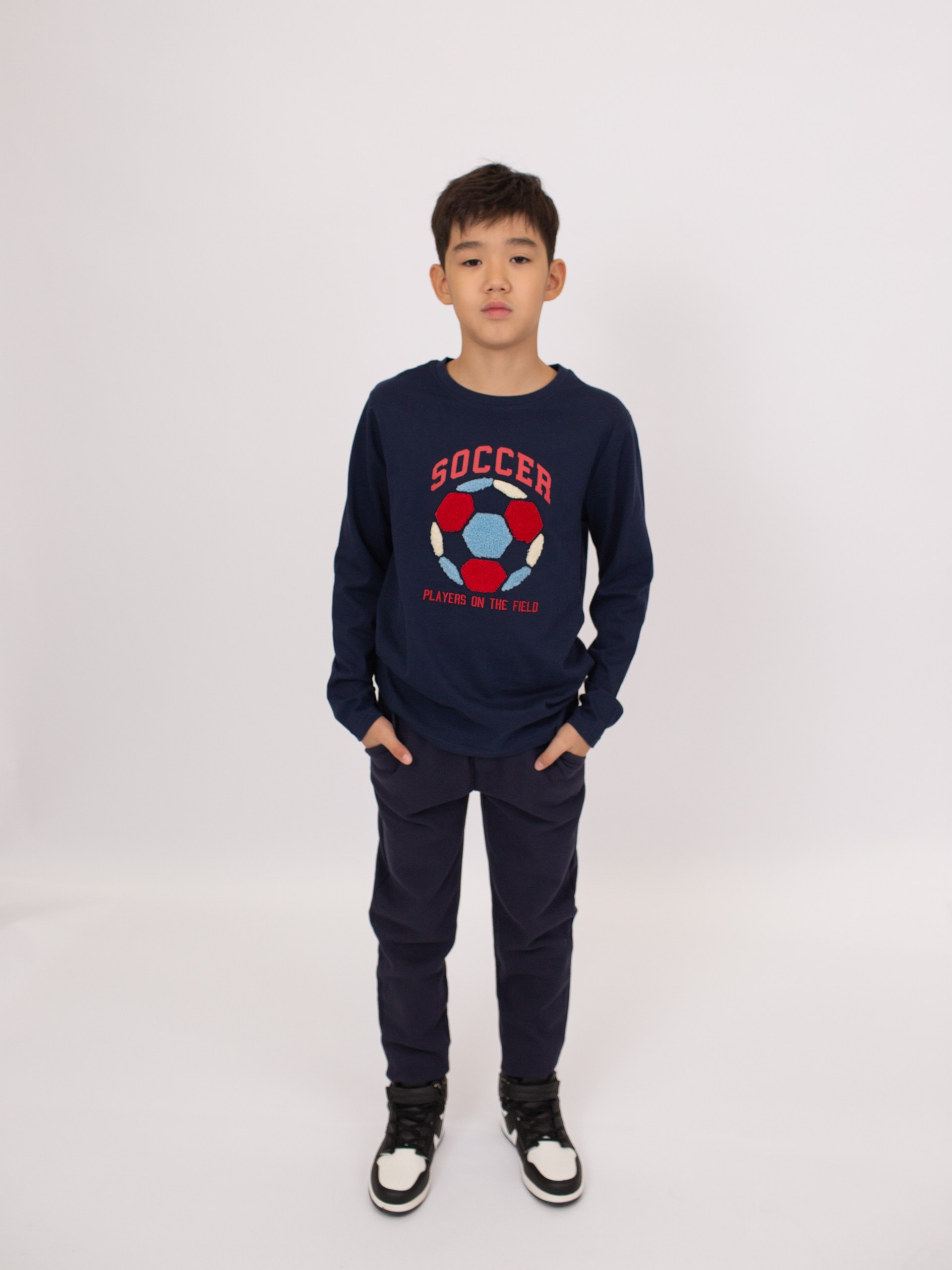 Футболка с длинными рукавами из мягкого трикотажа однотонного цвета. Спереди крупная декоративная вышивка с объёмным эффектом и контрастная надпись. Круглый вырез из трикотажа в рубчик. Спинка однотонная.