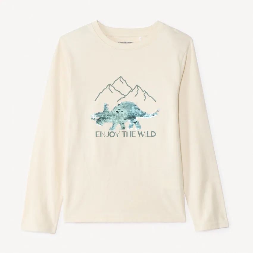 Лонгслив из мягкого трикотажа в однотонном цвете. Модель с удобным круглым вырезом украшена фантазийным принтом на передней части и волшебными мерцающими пайетками, которые меняют рисунок при проведении рукой. Спинка остаётся однотонной. Отлично подойдёт для повседневных образов и игр.