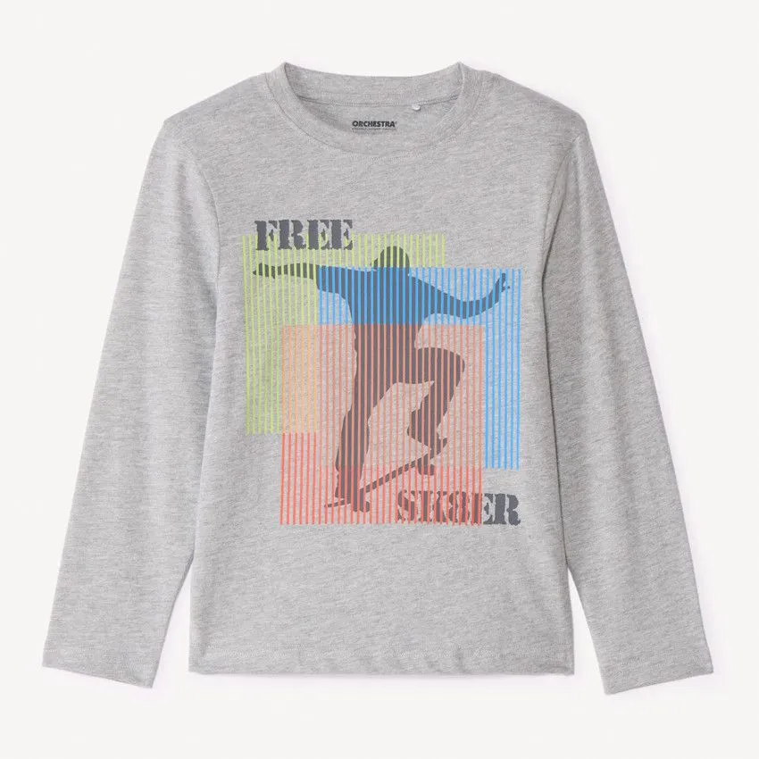 По центру расположен яркий принт, который делает образ выразительным и современным, добавляя футболке динамичный характер. Длинные рукава делают модель универсальной для прохладной погоды.