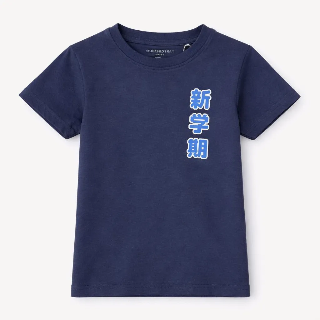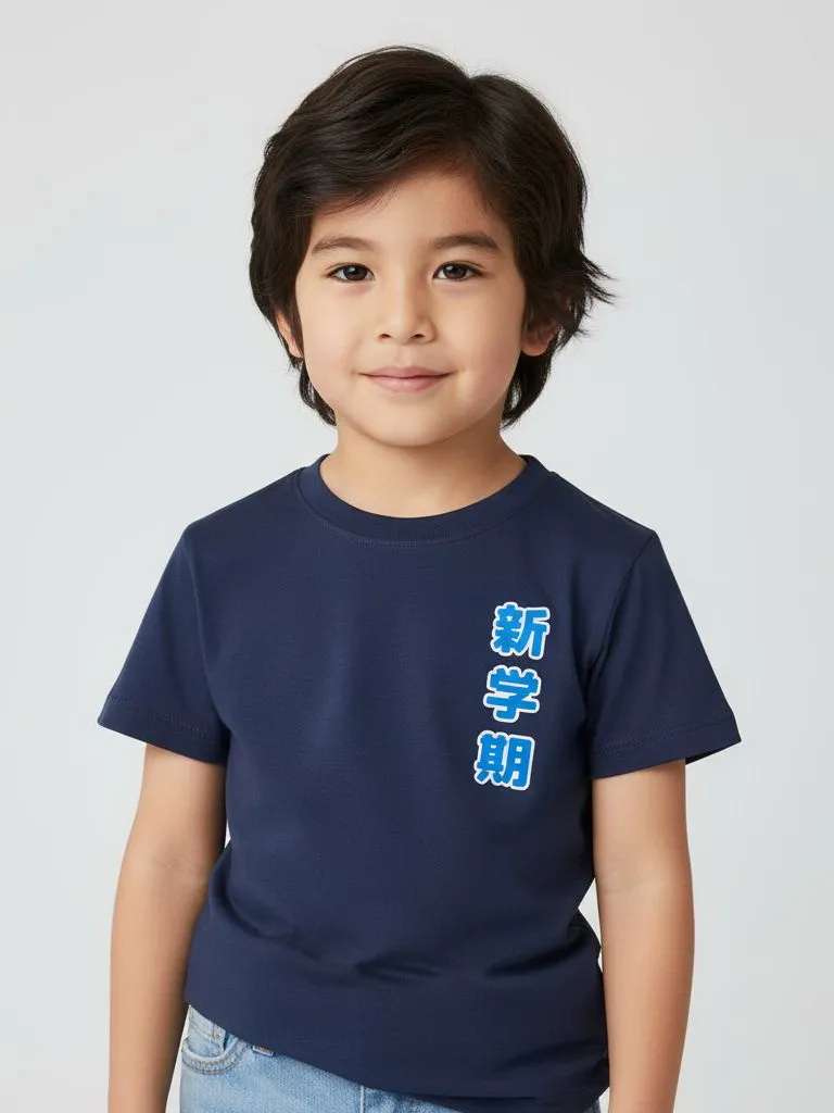 Классический круглый вырез и короткие рукава обеспечивают удобную посадку и свободу движений. На передней части расположен небольшой декоративный принт с иероглифами, который придаёт модели современный и оригинальный вид.