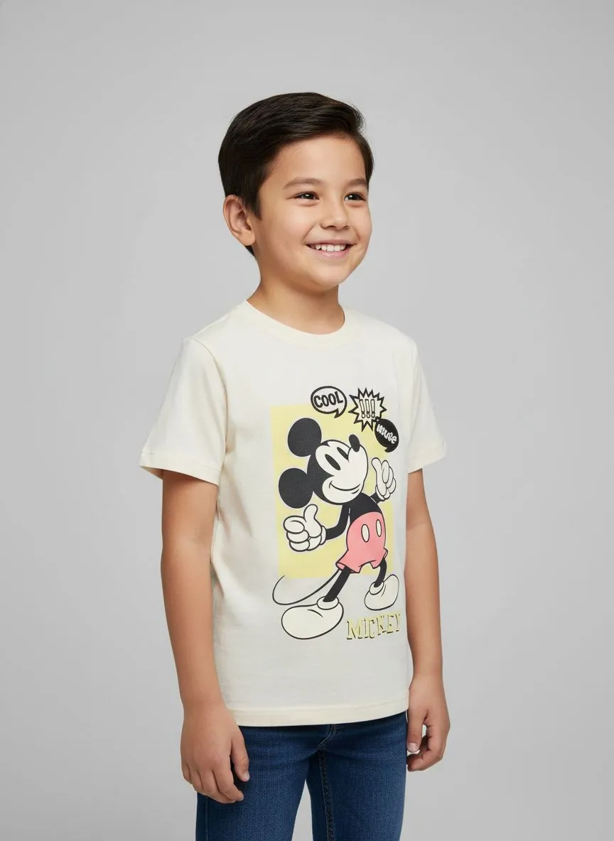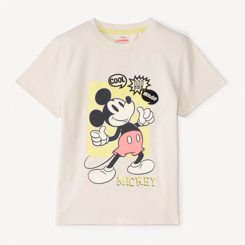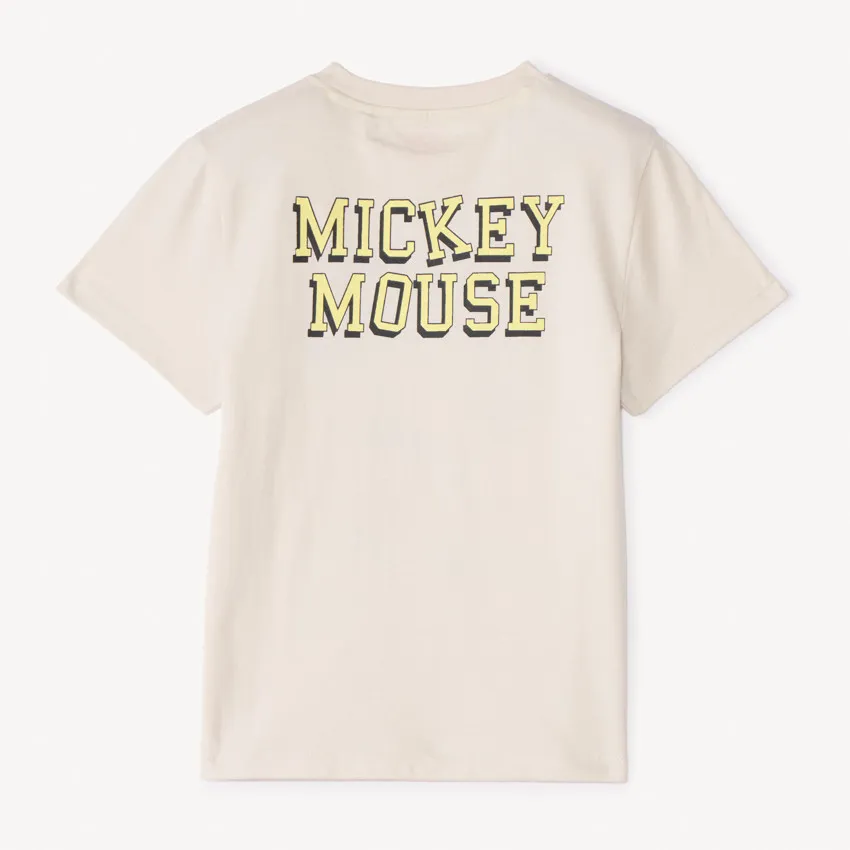 Круглый вырез из эластичной резинки дополнен контрастной окантовкой, что придаёт модели аккуратный и стильный вид. На передней части расположен принт с Микки, а на спинке — декоративная надпись.