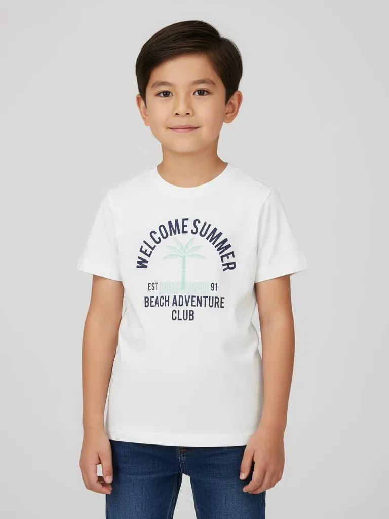Спереди расположен принт с надписью “Welcome Summer – Beach Adventure Club” и изображением пальмы, который создаёт яркое летнее настроение.