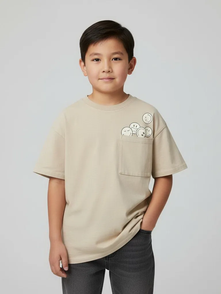 Модель дополнена классическим круглым вырезом и короткими рукавами. На груди расположен накладной карман с забавным принтом Smiley, который выглядит так, будто улыбающиеся смайлики выглядывают из кармана.