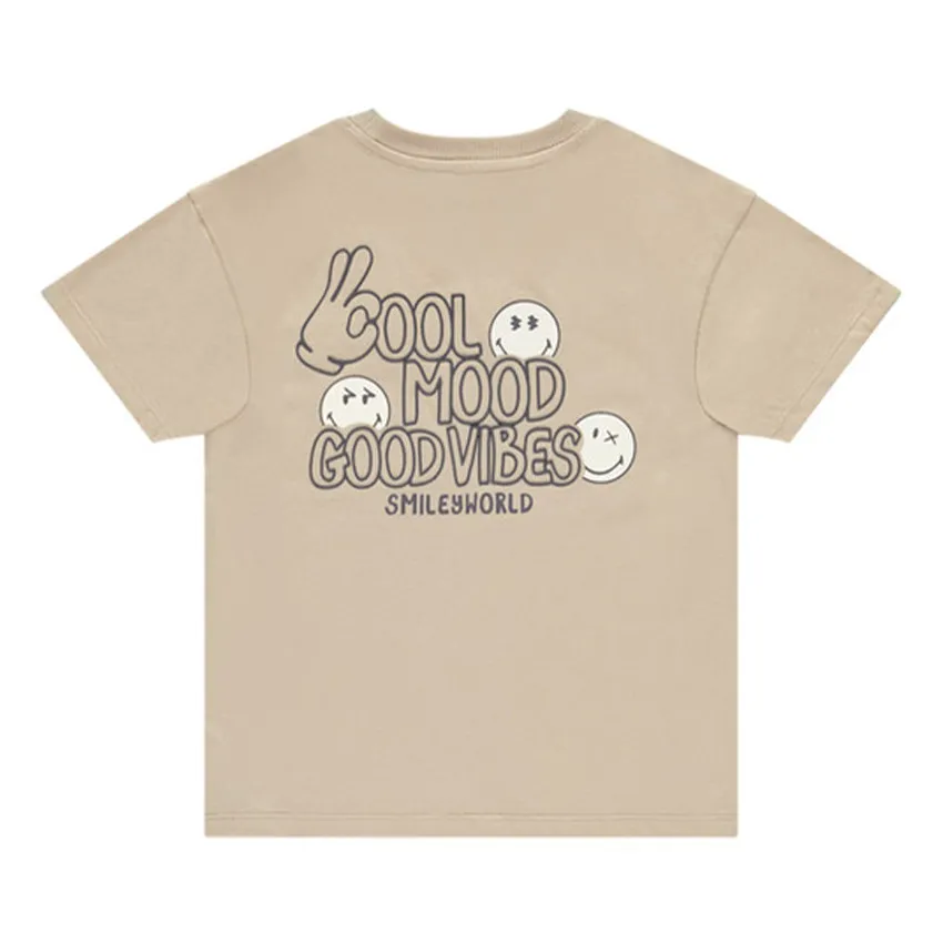 На спинке размещён крупный контрастный принт со смайликом и надписью, выполненной объёмным шрифтом, что придаёт футболке стильный и современный вид.