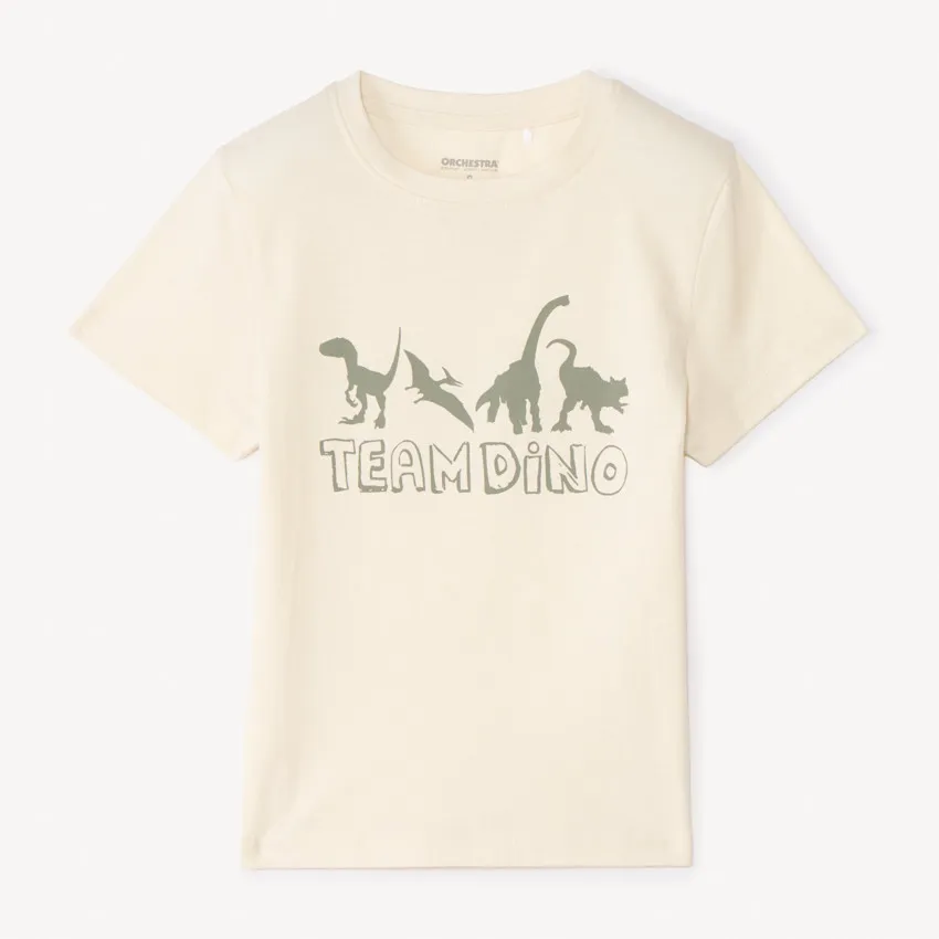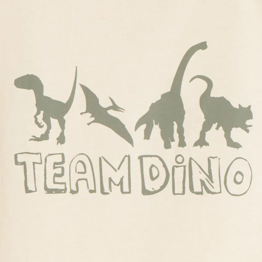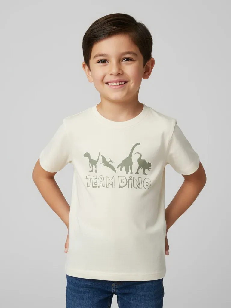 Спереди расположен принт с силуэтами динозавров и надписью “Team Dino”, который придаёт футболке яркий и интересный вид.