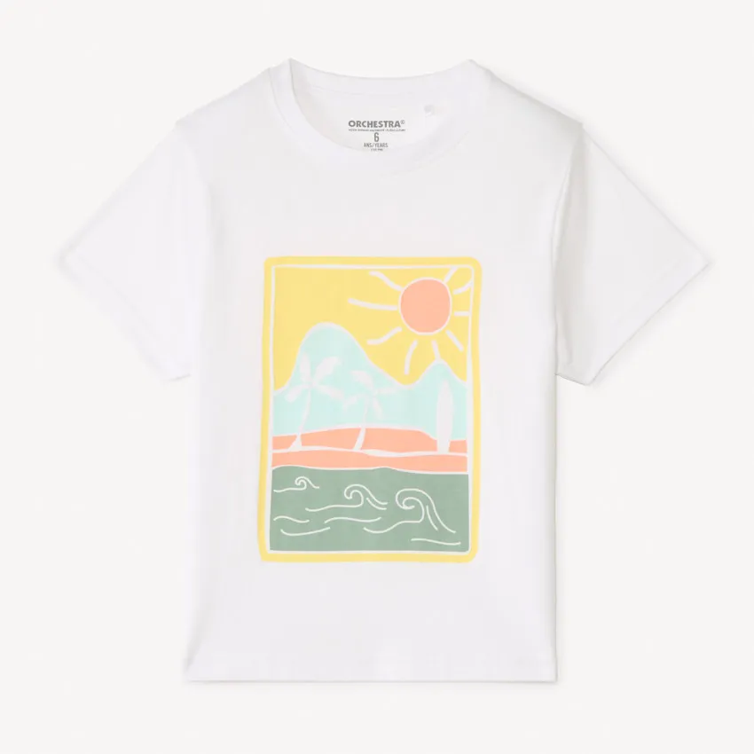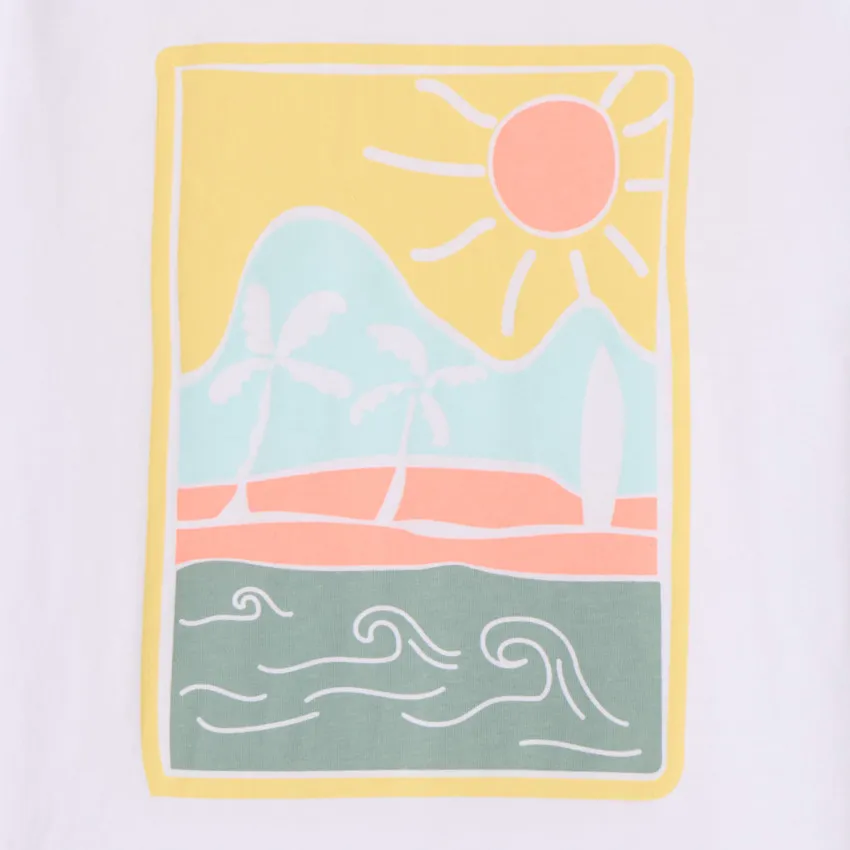 Спереди расположен яркий декоративный принт с летним пейзажем: солнцем, пальмами и морскими волнами, который создаёт атмосферу отдыха и тёплого сезона.