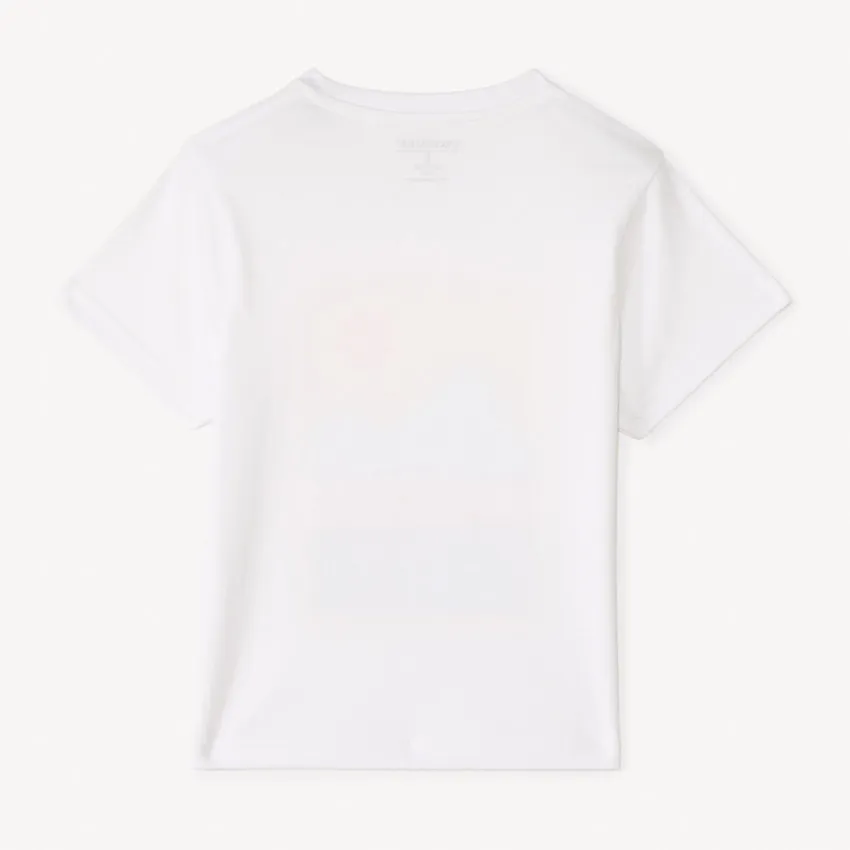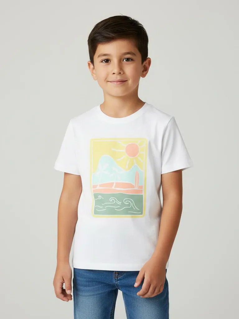 Модель дополнена круглым вырезом с эластичной отделкой и короткими рукавами, благодаря чему футболка удобна для прогулок и активных игр.