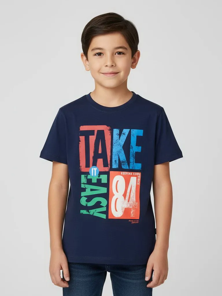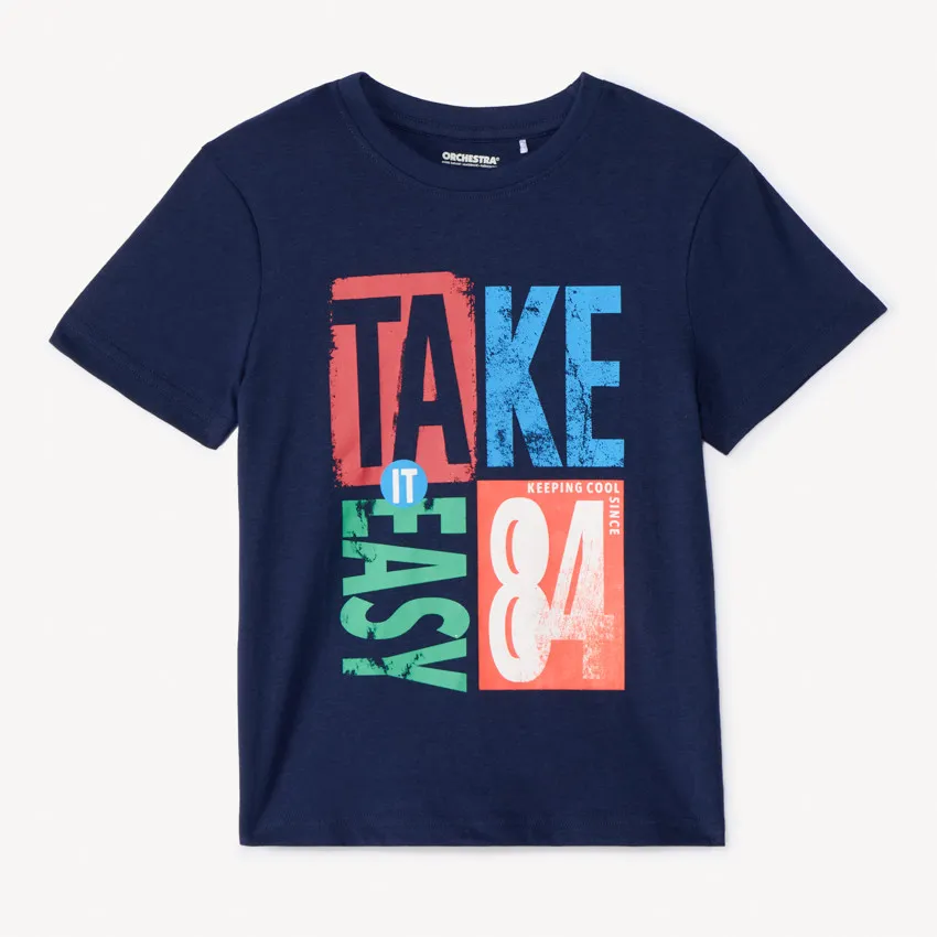 Спереди расположен крупный графический принт с надписями “Take it Easy” и декоративными элементами, выполненными в ярких контрастных цветах, что придаёт футболке современный и динамичный стиль.