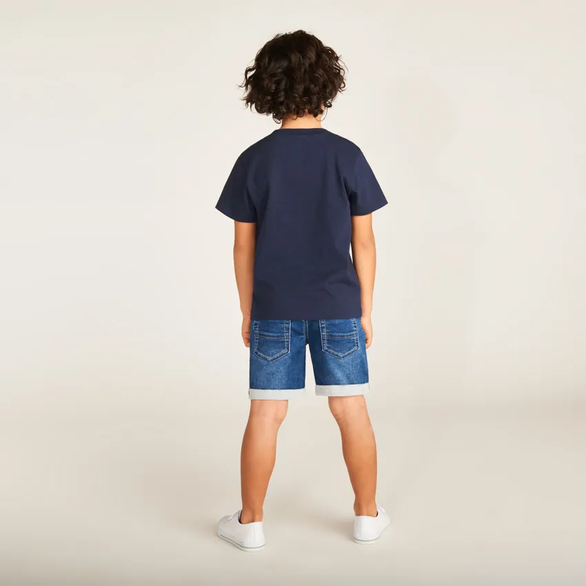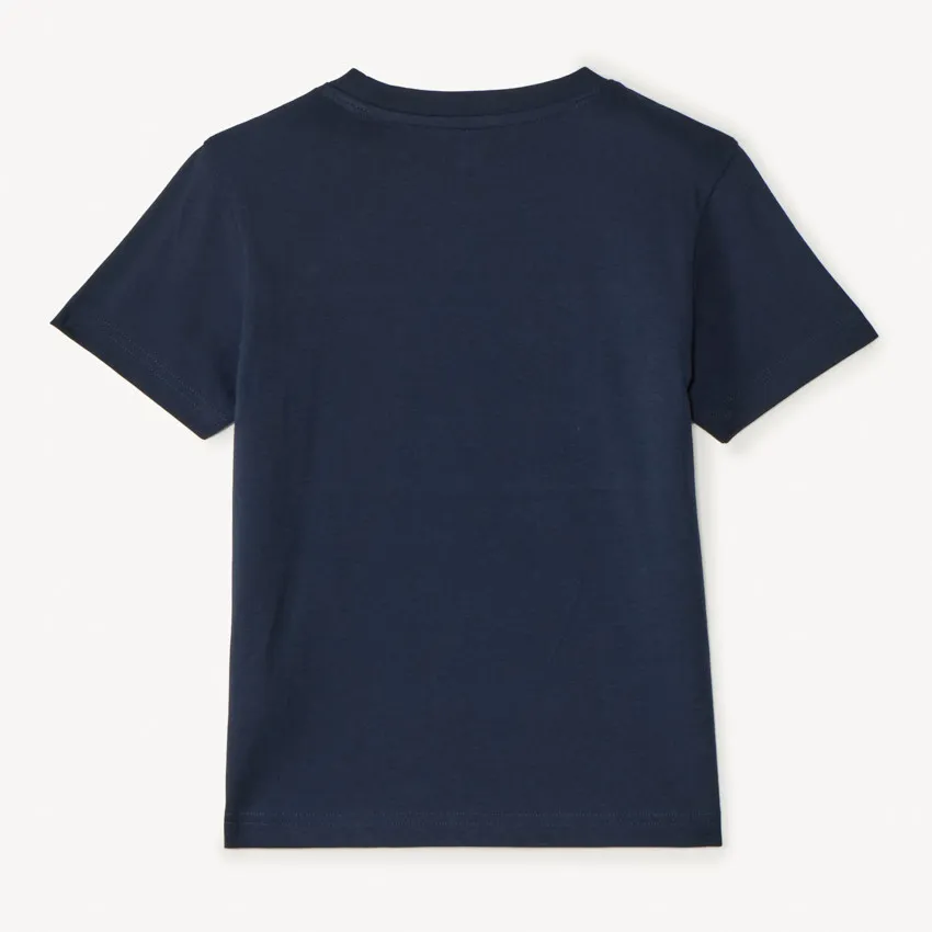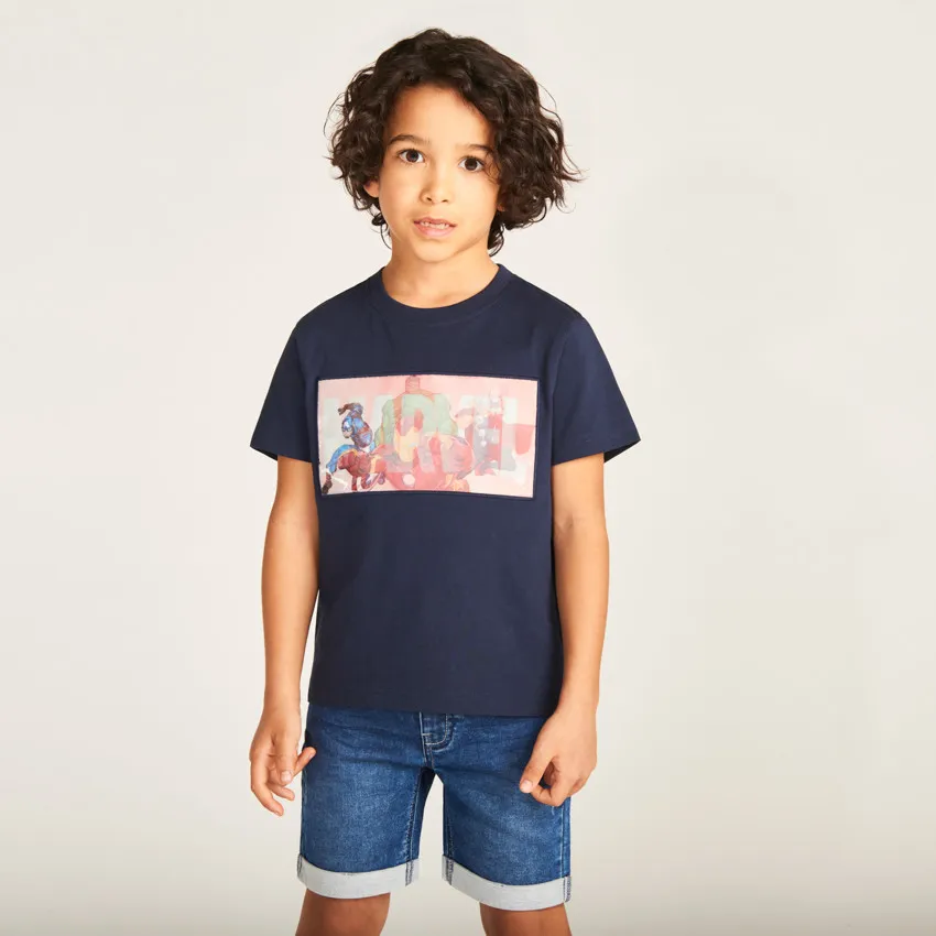 Модель дополнена круглым вырезом с эластичной отделкой и короткими рукавами, благодаря чему футболка удобна для активных игр и повседневной носки.