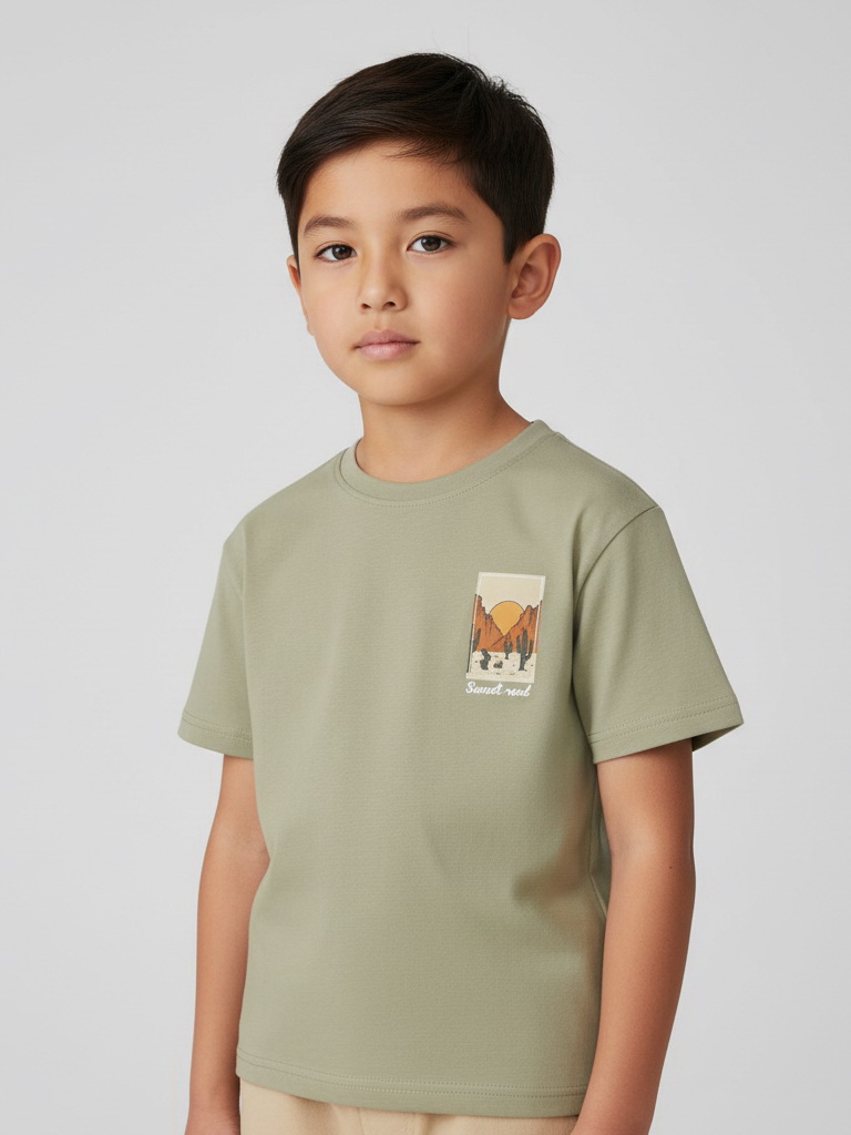 Модель выполнена из 100% натурального хлопка, материал мягкий, дышащий и приятный к телу, подходит для активного дня и чувствительной кожи ребёнка. Спереди на груди расположен аккуратный принт, который добавляет образу стильный акцент. Сзади — крупный яркий рисунок, делающий футболку эффектной и запоминающейся.