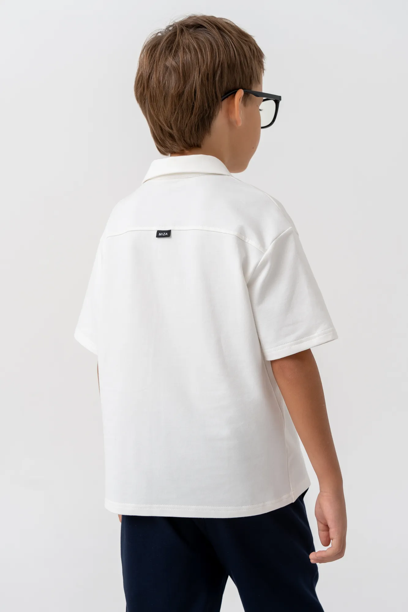 Уютная рубашка-поло из мягкого футера — тёплый и практичный вариант для школы в прохладную погоду. Модель без застёжки, легко надевается через голову. Воротник-стойка придаёт образу аккуратность, а плотный трикотаж обеспечивает комфорт и тепло. Отлично сочетается с брюками, жилетами и джемперами.