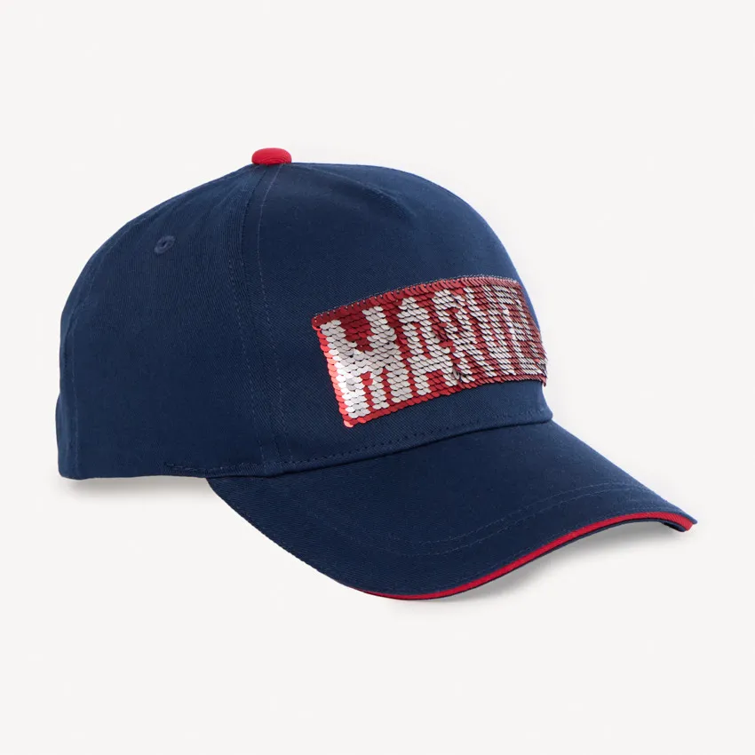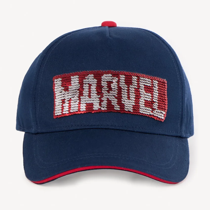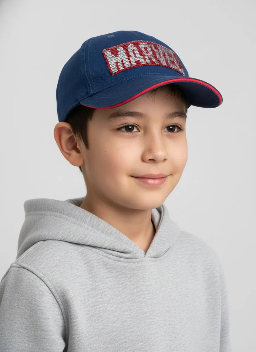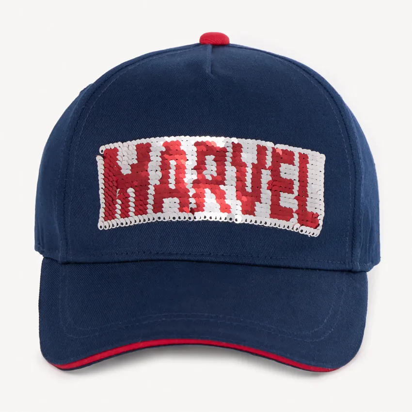 Стильная кепка тёмно-синего цвета станет ярким аксессуаром для ребёнка. Спереди расположен дизайн Marvel с эффектными переворачивающимися пайетками.