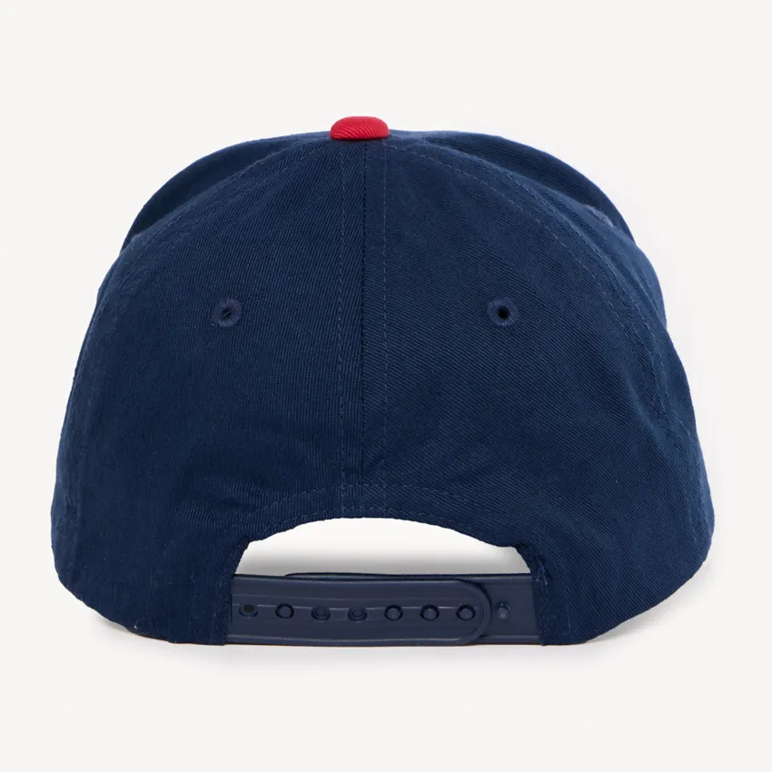 В верхней части предусмотрены дышащие отверстия, которые помогают сохранять комфорт в тёплую погоду. Козырёк украшен аккуратной строчкой и контрастной окантовкой, а сзади расположен регулируемый ремешок для удобной посадки.