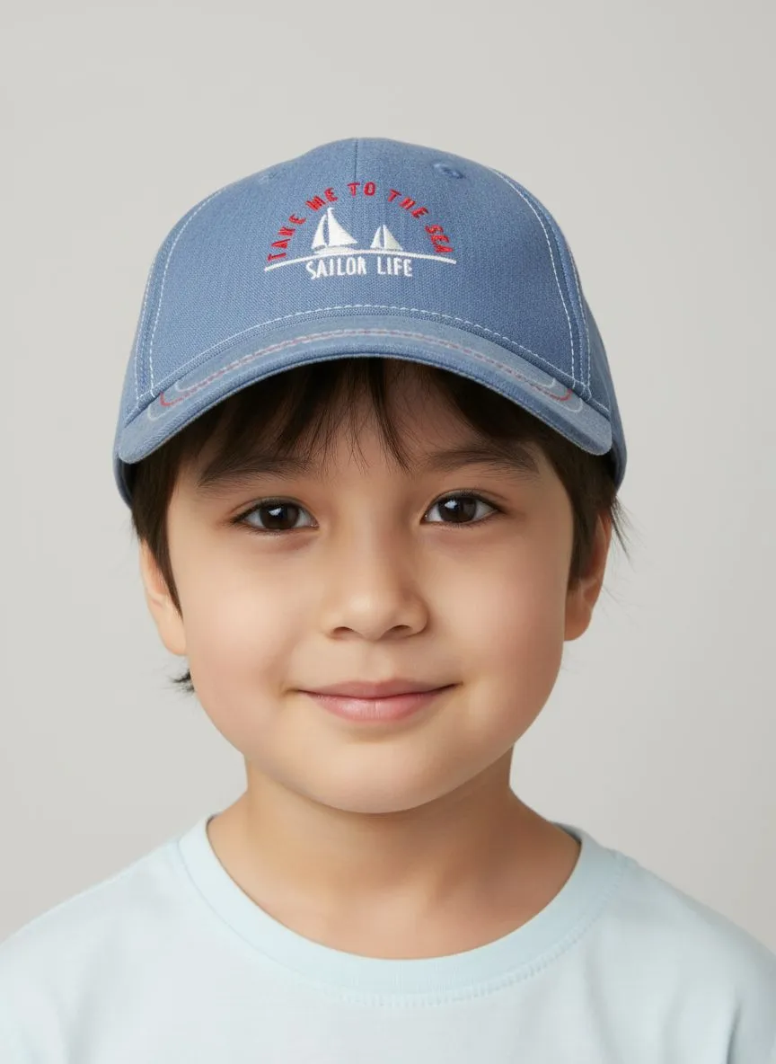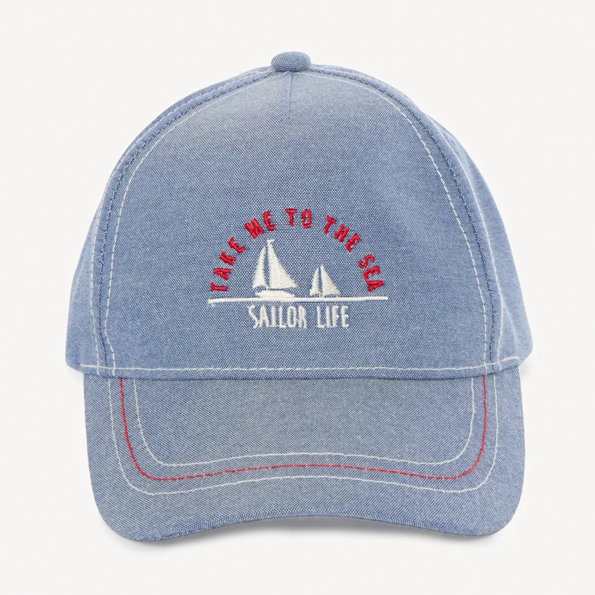 Стильная кепка в синем цвете с эффектом джинсовой ткани станет отличным аксессуаром для повседневных прогулок. Спереди модель украшена вышивкой с изображением кораблика в бело-красных оттенках.