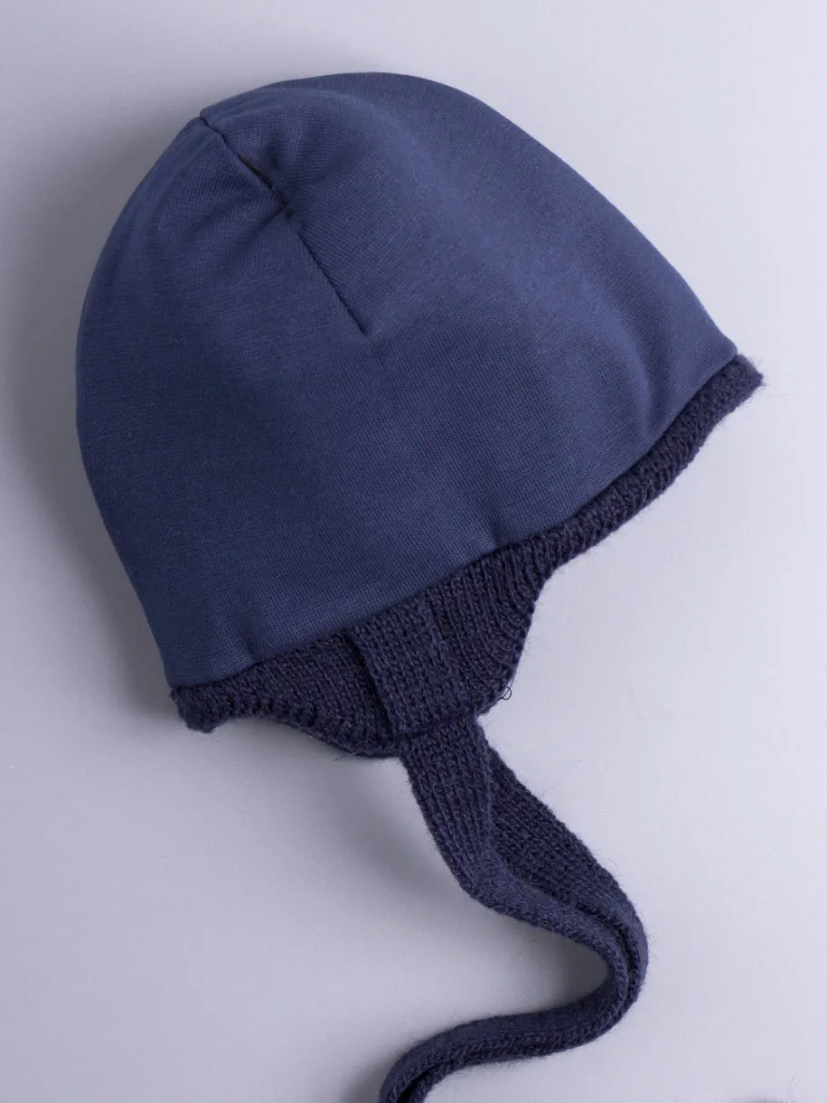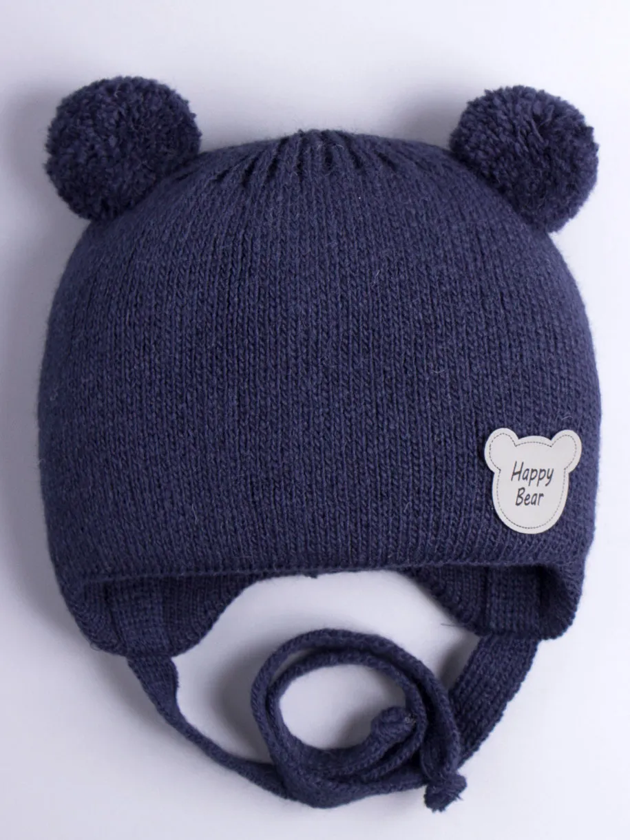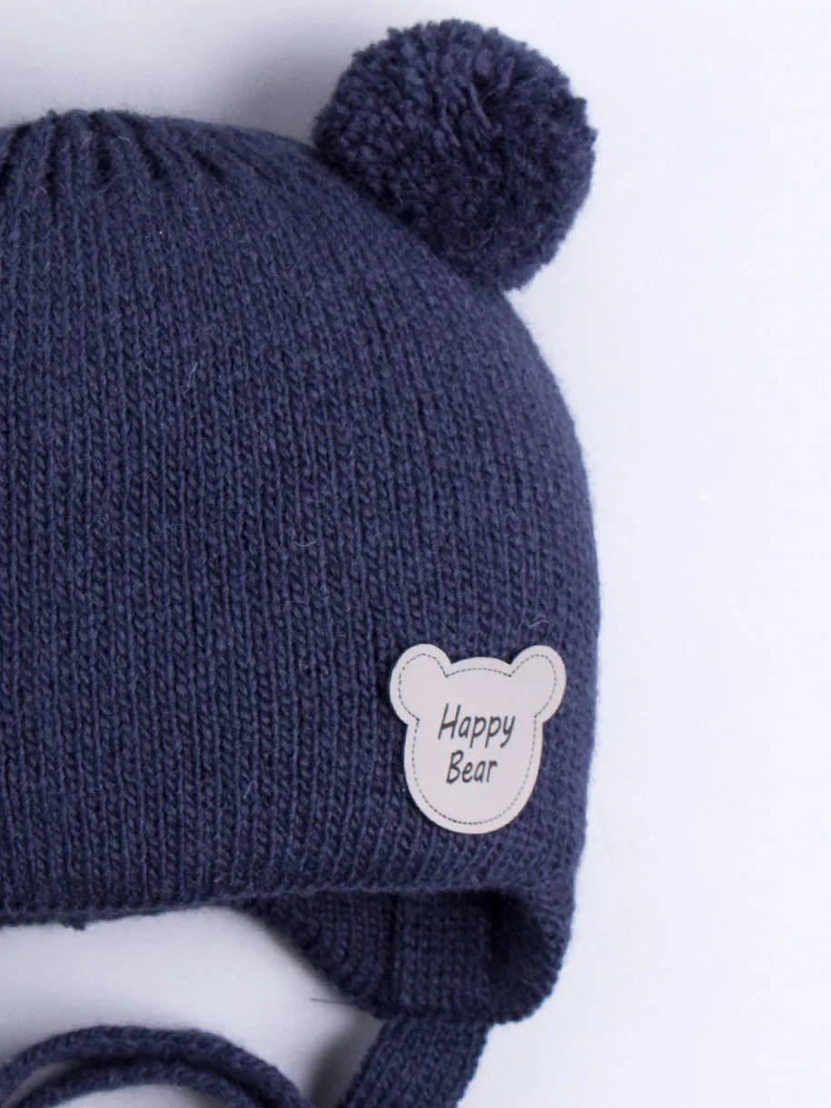 | Вязаная детская шапка тёмно-синего цвета с завязками и объёмными помпонами-ушками. Украшена нашивкой с надписью Happy Bear. Модель выполнена из мягкой пряжи с добавлением шерсти, хорошо сохраняет тепло и обеспечивает комфорт в прохладную погоду. Подходит для сезона весна/осень. |