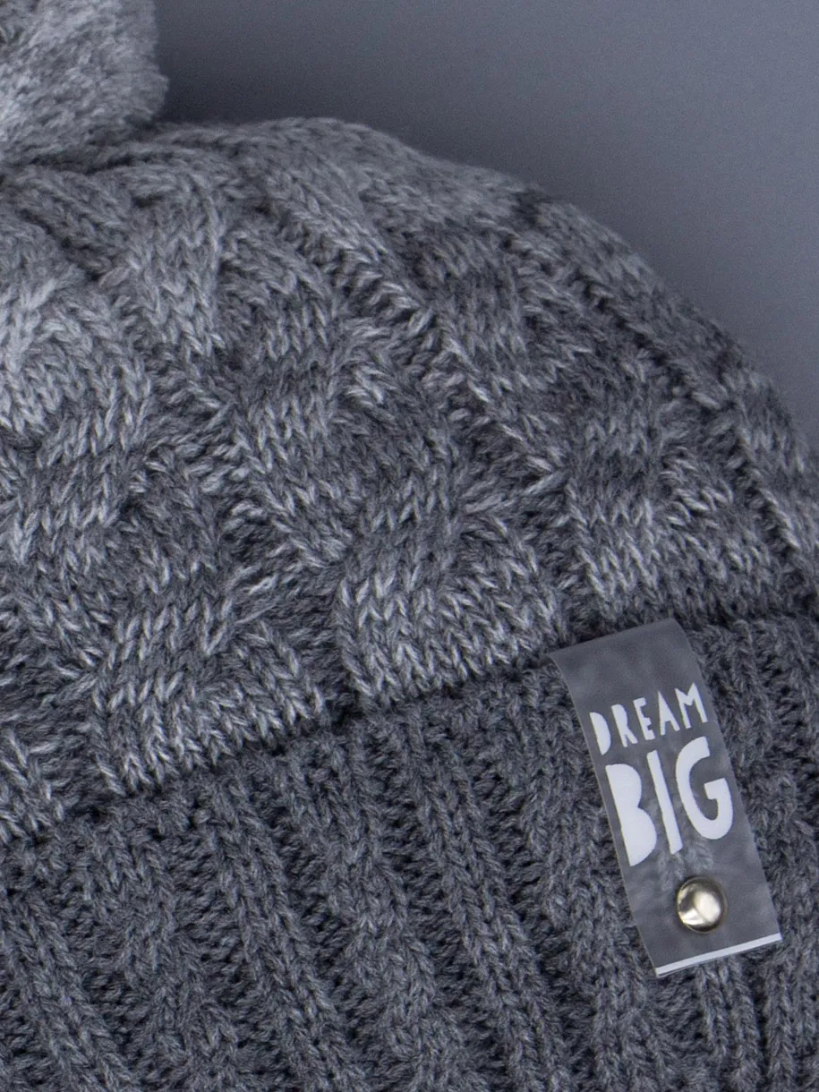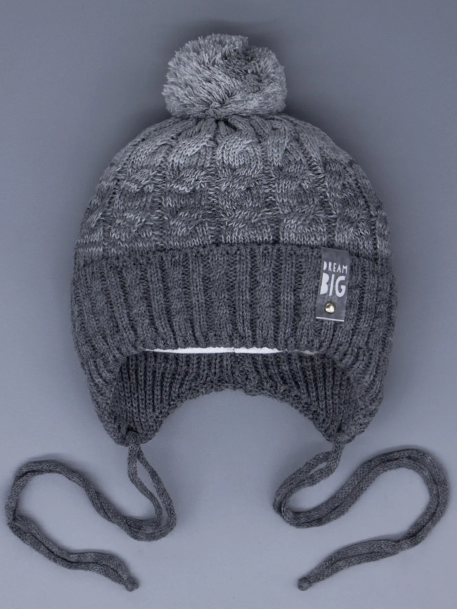 Детская вязаная шапка на завязках с объёмным помпоном. Модель выполнена из пряжи с добавлением шерсти (30%) и акрила (70%), что делает её тёплой и мягкой. Внутри хлопковая подкладка, обеспечивающая комфорт и уют. Стильный серый цвет и фактурный узор дополняются нашивкой с надписью. Отличный выбор для сезона весна/осень.