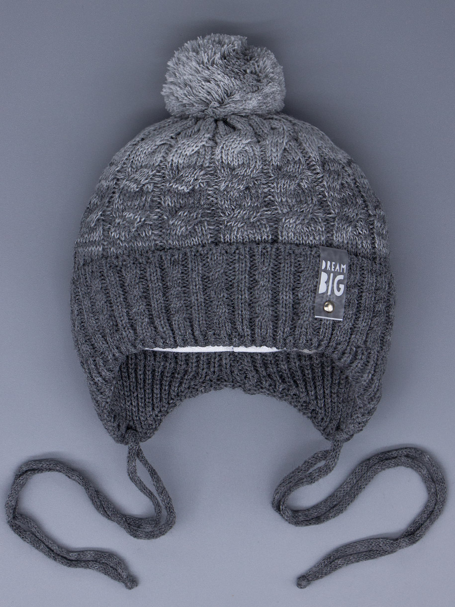 Детская вязаная шапка на завязках с объёмным помпоном. Модель выполнена из пряжи с добавлением шерсти (30%) и акрила (70%), что делает её тёплой и мягкой. Внутри хлопковая подкладка, обеспечивающая комфорт и уют. Стильный серый цвет и фактурный узор дополняются нашивкой с надписью. Отличный выбор для сезона весна/осень.