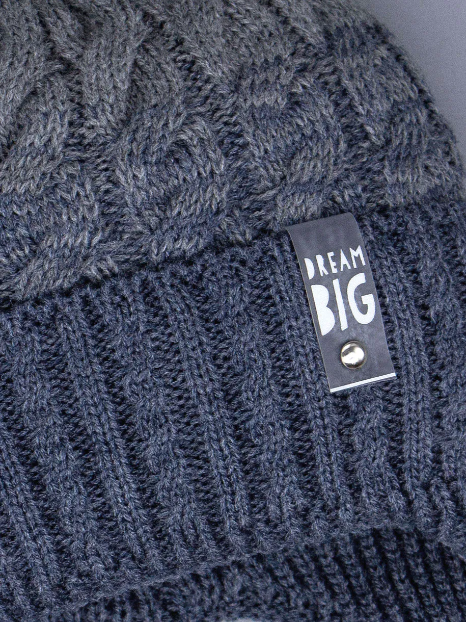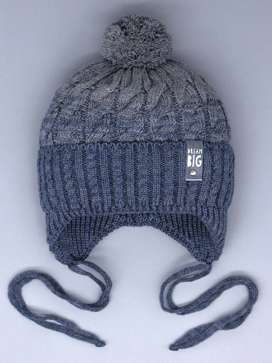 Детская вязаная шапка на завязках с объёмным помпоном. Модель выполнена из пряжи с добавлением шерсти (30%) и акрила (70%), что делает её тёплой и мягкой. Внутри хлопковая подкладка, обеспечивающая комфорт и уют. Стильный серый цвет и фактурный узор дополняются нашивкой с надписью. Отличный выбор для сезона весна/осень.