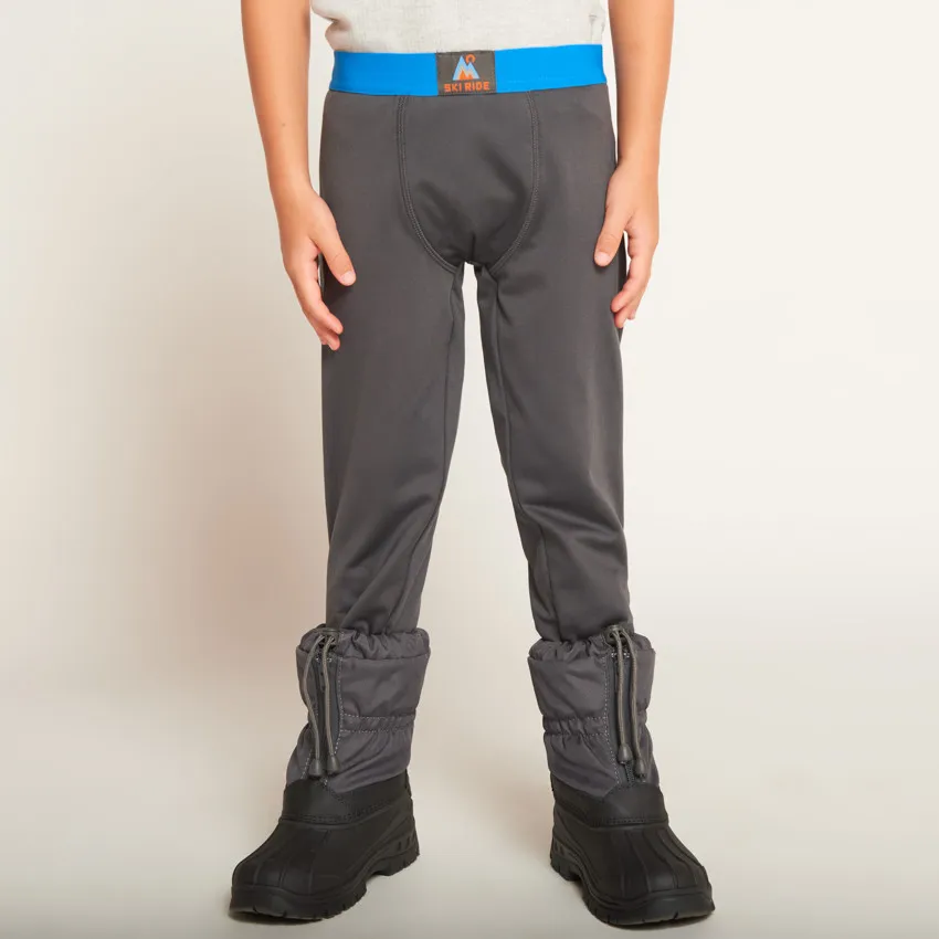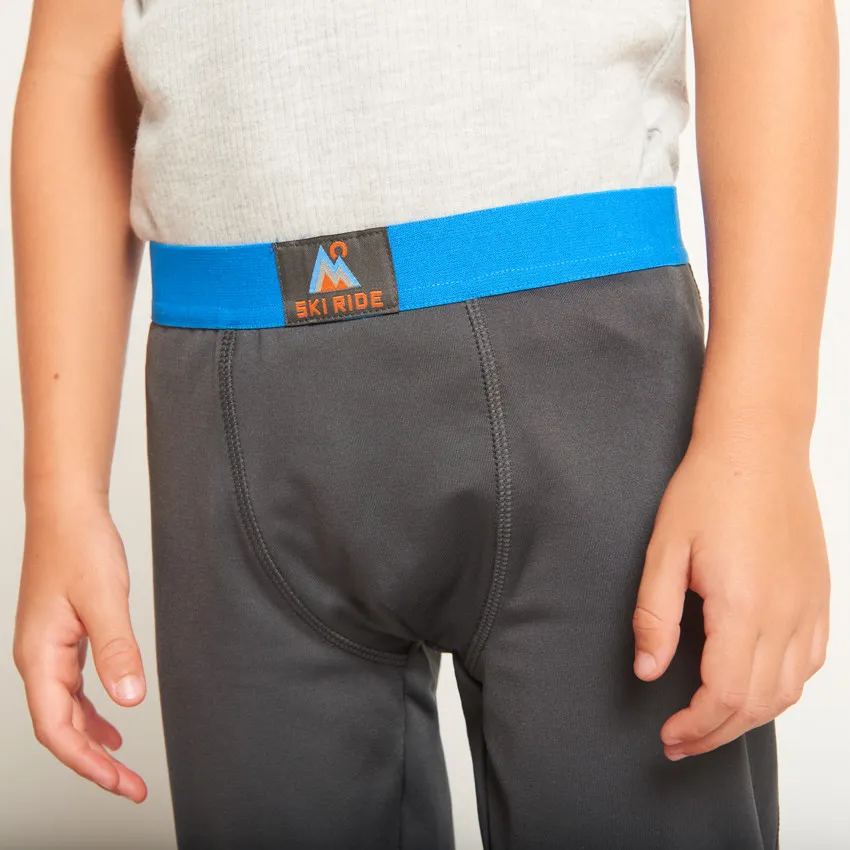 Кальсоны из мягкого трикотажа в сером цвете, выполненные в спортивном стиле ski. Модель имеет удобную эластичную талию с контрастной синей отделкой и небольшой нашивкой «Ski Ride» спереди. Ткань приятная к телу, хорошо тянется и не стесняет движений, обеспечивая комфорт во время активных занятий или в качестве тёплого базового слоя. Спинка выполнена полностью однотонной.
