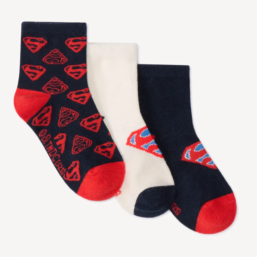 Набор из 3 пар трикотажных носков с мотивом Superman. В комплект входят: светлая модель с жаккардовым рисунком спереди, темно-синяя пара с красным принтом по всей поверхности и однотонные темно-синие носки с контрастным мотивом спереди. Все модели с усиленными носками и пятками, плотно облегают щиколотку для комфортной посадки.