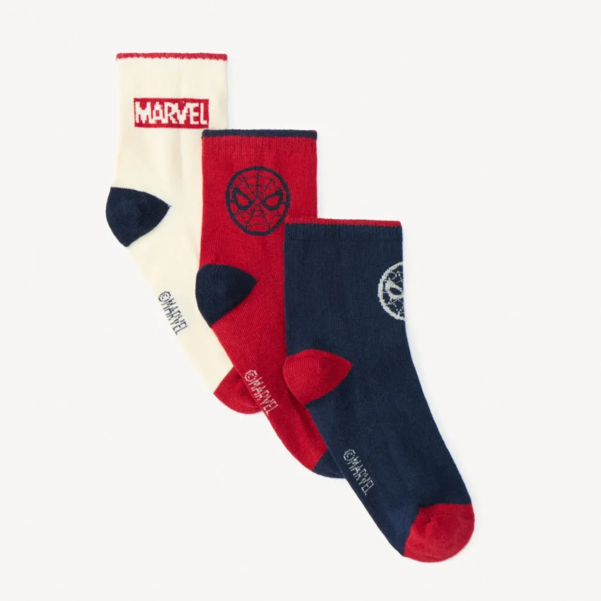 Набор из трёх пар носков с лицензией Spider-Man (Marvel). Модели выполнены в разных цветах и с жаккардовыми рисунками. Удобные эластичные манжеты с контрастным кантом, носки и пятки также выделены цветом. В комплекте: одна пара в цвете экрю с рисунком у щиколотки, одна пара красная с рисунком у щиколотки и одна пара тёмно-синяя с рисунком спереди.