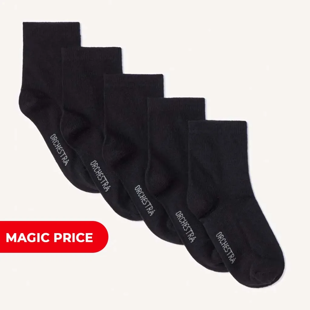 Набор из пяти пар однотонных носков для мальчиков — практичный вариант на каждый день. Эластичные ребристые манжеты обеспечивают надёжную посадку и комфорт без сдавливания. Мягкий хлопковый материал приятен к коже, хорошо сохраняет форму и подходит для активной носки.